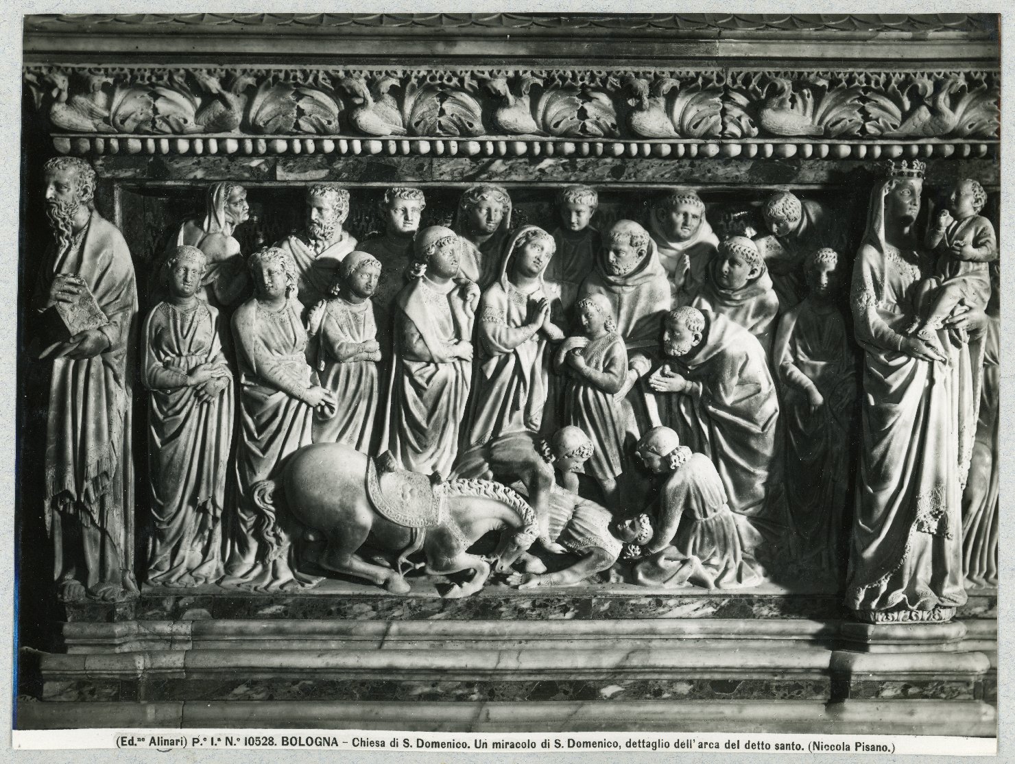 - ISCRIZIONI sul supporto primario: recto - (Ed. ne Alinari) P.°I.° N.° 10528. BOLOGNA - Chiesa di S. Domenico. Un miracolo di S. Domenico, dettaglio dell'arca del detto santo. (Niccola [SIC] Pisano.) -