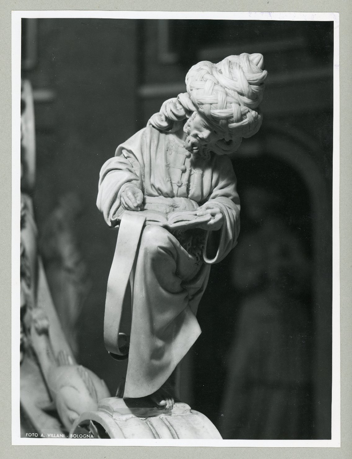 - NOTIZIE STORICO CRITICHE All'interno dell'archivio fotografico dell'ex Soprintendenza ai Monumenti di Bologna è individuabile un gruppo omogeneo di 8 positivi della ditta Villani, che fotografano alcune delle statuette dell'arca di San Domenico a Bologna, ovvero gli evangelisti e i santi protettori cittadini a tuttotondo (da P_000730 a P_000737). E' noto dagli scritti del soprintendente Alfredo Barbacci (vedi bib, 1977) che l'opera venne protetta dalle incursioni aeree tra il giugno e l'agosto del 1940 (come documenta il negativo inv. N_001884, con NCT 0800640710, appartenente all'archivio), per poi essere smontata nel 1943 e trovare ricovero nel primo appennino bolognese a Villa Aria di Marzabotto; al termine della seconda guerra mondiale, infine, fece ritorno nella basilica domenicana, recuperando la propria conformazione con il ripristino avvenuto tra il luglio ed il settembre del 1946. Il gruppo di stampe, secondo l'analisi tecnico formale, potrebbe indicativamente attestarsi tra gli anni Quaranta e gli anni Sessanta. E' possibile che le riprese - probabilmente eseguite in un'unica occasione - siano successive al recupero dell'opera: si propone una datazione dubitativa posteriore al ripristino completato nel settembre del 1946. Non va taciuto che il 3 ottobre del 1940 il soprintendente Venè scrisse allo studio Villani: "ho ricevuto le 20 copie 18x24 delle statue e tomba di S. Domenico. Vi restituisco la fattura erroneamente addebitatami" (prot. 3099, faldone BO M 20, vedi Fonti); i soggetti e il formato (oltre all'autore) del gruppo di stampe inviate nell'autunno del '40 alla soprintendenza potrebbero anche identificarsi con i positivi in esame (ipotizziamo tratti da negativi eseguiti prima dei blindamenti antiaerei), ma allo stato dei fatti, la traccia resta non verificabile. L'arca di San Domenico, vero e proprio palinsesto scultoreo realizzato tra il XIII e XVIII secolo, ha avuto una lunga storia di cambiamenti e aggiunte. Il sarcofago duecentesco, lavorato a rilievo da Nicola Pisano e aiuti (Arnolfo di Cambio e il converso domenicano Guglielmo da Pisa) e originariamente poggiato su colonnine, venne arricchito nel secondo Quattrocento dalla cimasa di Niccolò dell'Arca (con piccoli interventi del giovane Buonarroti); e ancora nel 1532 Alfonso Lombardi elaborò la stele istoriata sulla quale poggia il sarcofago. Infine Jean-Baptiste Boudard nel 1768 eseguì il paliotto scultoreo dell'altare su cui è stata collocata l'intera arca