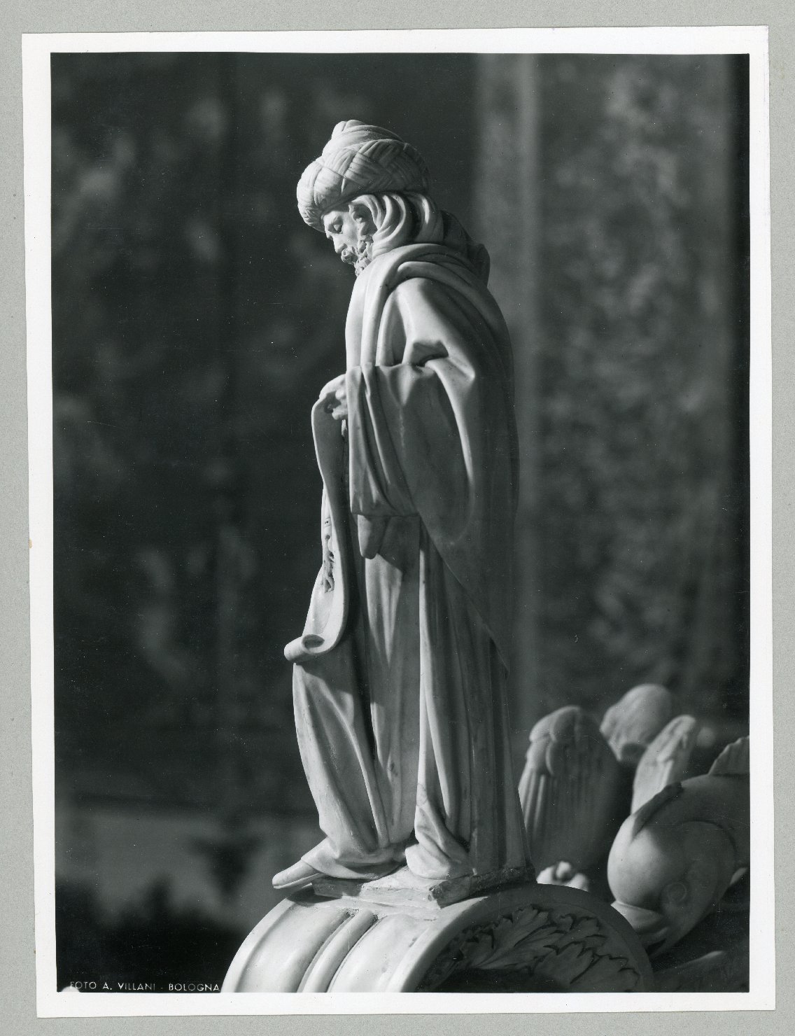 - NOTIZIE STORICO CRITICHE All'interno dell'archivio fotografico dell'ex Soprintendenza ai Monumenti di Bologna è individuabile un gruppo omogeneo di 8 positivi della ditta Villani, che fotografano alcune delle statuette dell'arca di San Domenico a Bologna, ovvero gli evangelisti e i santi protettori cittadini a tuttotondo (da P_000730 a P_000737). E' noto dagli scritti del soprintendente Alfredo Barbacci (vedi bib, 1977) che l'opera venne protetta dalle incursioni aeree tra il giugno e l'agosto del 1940 (come documenta il negativo inv. N_001884, con NCT 0800640710, appartenente all'archivio), per poi essere smontata nel 1943 e trovare ricovero nel primo appennino bolognese a Villa Aria di Marzabotto; al termine della seconda guerra mondiale, infine, fece ritorno nella basilica domenicana, recuperando la propria conformazione con il ripristino avvenuto tra il luglio ed il settembre del 1946. Il gruppo di stampe, secondo l'analisi tecnico formale, potrebbe indicativamente attestarsi tra gli anni Quaranta e gli anni Sessanta. E' possibile che le riprese - probabilmente eseguite in un'unica occasione - siano successive al recupero dell'opera: si propone una datazione dubitativa posteriore al ripristino completato nel settembre del 1946. Non va taciuto che il 3 ottobre del 1940 il soprintendente Venè scrisse allo studio Villani: "ho ricevuto le 20 copie 18x24 delle statue e tomba di S. Domenico. Vi restituisco la fattura erroneamente addebitatami" (prot. 3099, faldone BO M 20, vedi Fonti); i soggetti e il formato (oltre all'autore) del gruppo di stampe inviate nell'autunno del '40 alla soprintendenza potrebbero anche identificarsi con i positivi in esame (ipotizziamo tratti da negativi eseguiti prima dei blindamenti antiaerei), ma allo stato dei fatti, la traccia resta non verificabile. L'arca di San Domenico, vero e proprio palinsesto scultoreo realizzato tra il XIII e XVIII secolo, ha avuto una lunga storia di cambiamenti e aggiunte. Il sarcofago duecentesco, lavorato a rilievo da Nicola Pisano e aiuti (Arnolfo di Cambio e il converso domenicano Guglielmo da Pisa) e originariamente poggiato su colonnine, venne arricchito nel secondo Quattrocento dalla cimasa di Niccolò dell'Arca (con piccoli interventi del giovane Buonarroti); e ancora nel 1532 Alfonso Lombardi elaborò la stele istoriata sulla quale poggia il sarcofago. Infine Jean-Baptiste Boudard nel 1768 eseguì il paliotto scultoreo dell'altare su cui è stata collocata l'intera arca
