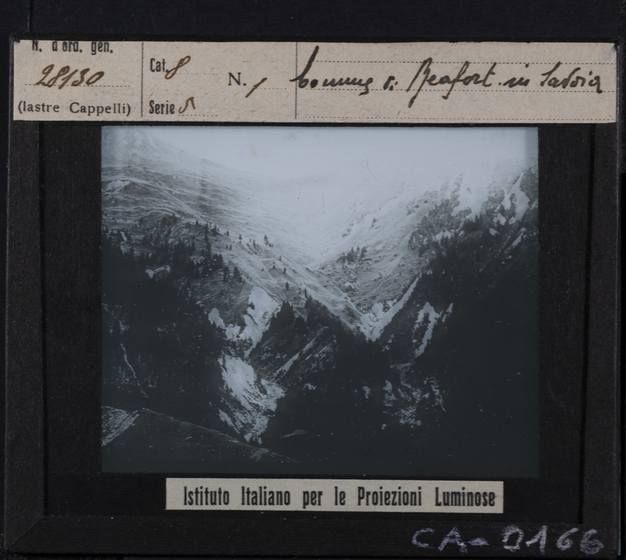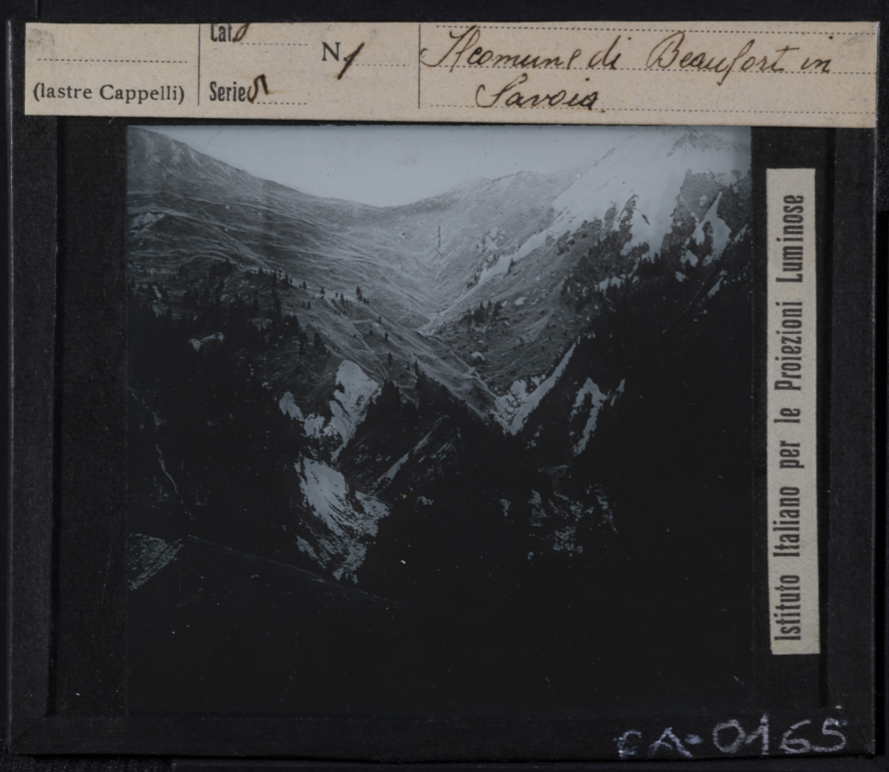 Diapositive alla gelatina bromuro d'argento su vetro, montaggio a pacchetto con lastra di protezione e carta gommata nera incollata ai quattro lati