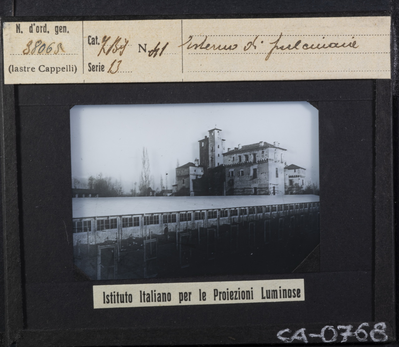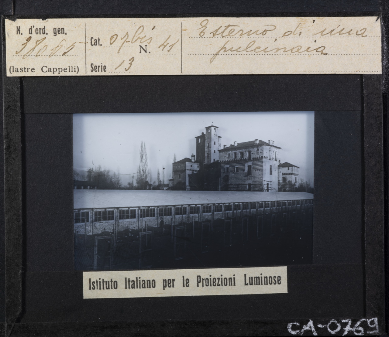 - NOTIZIE STORICO CRITICHE I materiali presenti nel fondo lasciano supporre una riproduzione da positivi o da libri, come spesso si deduce da mascherature che vanno a ricoprire titolazioni originali o dalla presenza di puntine da disegno usate per fissare ad un supporto la fotografia da duplicare. Le diapositive fotografiche su vetro per lanterna magica sono realizzate tra il 1921 e il 1932 a Milano, con riprese eseguite dall’Istituto Italiano per le Proiezioni Luminose (1921-1935 ca.) e lastre prodotte dalla ditta Cappelli (1885-1932), industria di grande rilievo che si impone sul mercato italiano, soprattutto dopo l’avvento della gelatina bromuro d’argento che semplifica il processo di sviluppo e stampa dei negativi e rende possibile una svolta verso l’industrializzazione in campo fotografico. Le speciali proiezioni delle immagini, effettuate con proiettori al carburo (acetilene), illustrano le lezioni di agricoltura e zootecnica che si tengono in modo itinerante in varie località dell’area bolognese. Tali lezioni sono promosse a livello nazionale dalle Cattedre Ambulanti di Agricoltura, una Istituzione nata nella seconda metà dell’Ottocento, quando le università del Paese riescono a formare i primi agronomi e quando si consolidano gli istituti agrari: sono gli uomini formatisi nelle scuole agrarie a guidare le prime cattedre, la loro determinazione porta allo sviluppo dell’agricoltura italiana, il loro scopo iniziale è quello di tenere delle conferenze di “propaganda agricola”, che consentano di diffondere nuove tecniche e raggiungere gli agricoltori anche nelle campagne più sperdute. L’insegnamento delle buone pratiche agricole serve a combattere l’ignoranza e l’isolamento della società rurale, i risultati sono subito tangibili: incremento della produzione agricola e del patrimonio zootecnico, introduzione e diffusione di nuove piante e varietà. La Cattedra Ambulante di Agricoltura di Bologna (in seguito Ufficio provinciale per l’Agricoltura) è attiva dal 1893 al 1935, ne sono presidenti Domizio Cavazza e poi Luigi Zerbini, nella sua genesi ha un ruolo primario il Comizio agrario di Bologna (inaugurato nel 1867, nel 1915 si separa dalla Cattedra) presieduto da Luigi Pizzardi e poi da Enrico Pini. Organi ufficiali del Comizio agrario di Bologna e della Cattedra Ambulante di Agricoltura di Bologna sono i periodici “L’Italia agricola” (1869-1991), “L’agricoltura bolognese” (1907-1929) e gli “Annali della cattedra provinciale di agricoltura e dell’ufficio tecnico del Comizio agrario di Bologna” (1893-1912). Con la legge n. 1220 del 13 giugno 1935 la Cattedra Ambulante di Agricoltura di Bologna viene soppressa e sostituita dall’Ispettorato provinciale di Agricoltura. Nelle diapositive con inventario MCCBO_CA_0767-0769 compaiono il Castello di Gaglianico, situato in provincia di Biella, e il parco di allevamento intensivo di pollame ricavato nel terreno circostante. Sin dal 1915 l’allevamento razionale del pollame è promosso dal cavaliere Carlo Trossi, industriale della lana di Biella, proprietario del Castello di Gaglianico e fondatore della Società avicola biellese