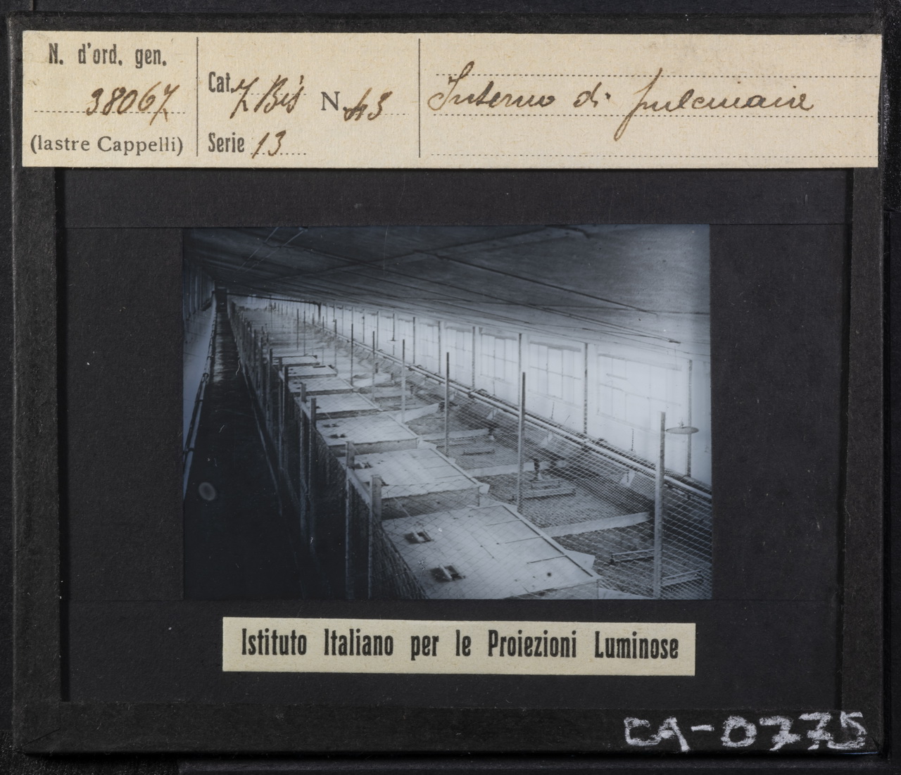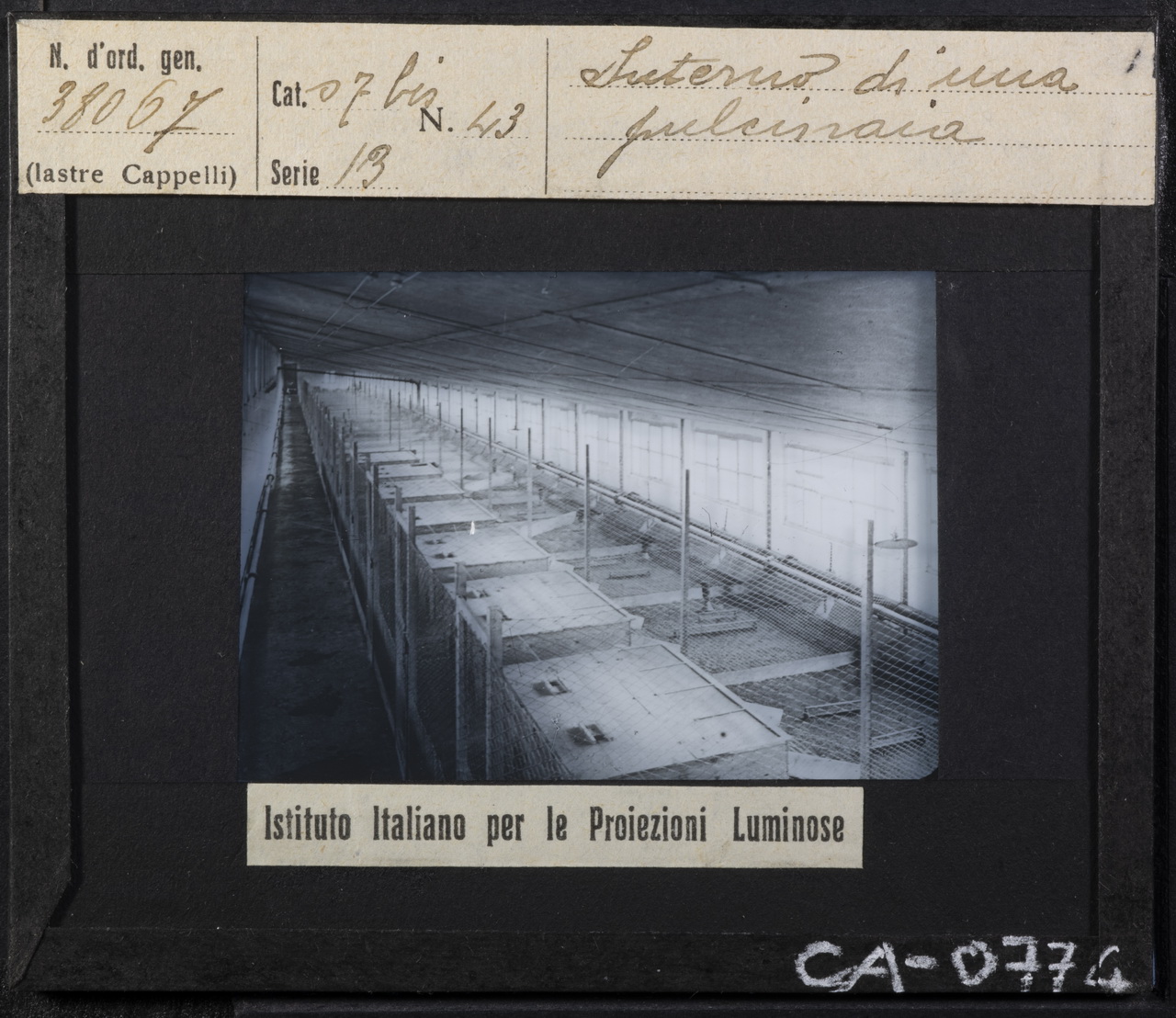 - NOTIZIE STORICO CRITICHE I materiali presenti nel fondo lasciano supporre una riproduzione da positivi o da libri, come spesso si deduce da mascherature che vanno a ricoprire titolazioni originali o dalla presenza di puntine da disegno usate per fissare ad un supporto la fotografia da duplicare. Le diapositive fotografiche su vetro per lanterna magica sono realizzate tra il 1921 e il 1932 a Milano, con riprese eseguite dall’Istituto Italiano per le Proiezioni Luminose (1921-1935 ca.) e lastre prodotte dalla ditta Cappelli (1885-1932), industria di grande rilievo che si impone sul mercato italiano, soprattutto dopo l’avvento della gelatina bromuro d’argento che semplifica il processo di sviluppo e stampa dei negativi e rende possibile una svolta verso l’industrializzazione in campo fotografico. Le speciali proiezioni delle immagini, effettuate con proiettori al carburo (acetilene), illustrano le lezioni di agricoltura e zootecnica che si tengono in modo itinerante in varie località dell’area bolognese. Tali lezioni sono promosse a livello nazionale dalle Cattedre Ambulanti di Agricoltura, una Istituzione nata nella seconda metà dell’Ottocento, quando le università del Paese riescono a formare i primi agronomi e quando si consolidano gli istituti agrari: sono gli uomini formatisi nelle scuole agrarie a guidare le prime cattedre, la loro determinazione porta allo sviluppo dell’agricoltura italiana, il loro scopo iniziale è quello di tenere delle conferenze di “propaganda agricola”, che consentano di diffondere nuove tecniche e raggiungere gli agricoltori anche nelle campagne più sperdute. L’insegnamento delle buone pratiche agricole serve a combattere l’ignoranza e l’isolamento della società rurale, i risultati sono subito tangibili: incremento della produzione agricola e del patrimonio zootecnico, introduzione e diffusione di nuove piante e varietà. La Cattedra Ambulante di Agricoltura di Bologna (in seguito Ufficio provinciale per l’Agricoltura) è attiva dal 1893 al 1935, ne sono presidenti Domizio Cavazza e poi Luigi Zerbini, nella sua genesi ha un ruolo primario il Comizio agrario di Bologna (inaugurato nel 1867, nel 1915 si separa dalla Cattedra) presieduto da Luigi Pizzardi e poi da Enrico Pini. Organi ufficiali del Comizio agrario di Bologna e della Cattedra Ambulante di Agricoltura di Bologna sono i periodici “L’Italia agricola” (1869-1991), “L’agricoltura bolognese” (1907-1929) e gli “Annali della cattedra provinciale di agricoltura e dell’ufficio tecnico del Comizio agrario di Bologna” (1893-1912). Con la legge n. 1220 del 13 giugno 1935 la Cattedra Ambulante di Agricoltura di Bologna viene soppressa e sostituita dall’Ispettorato provinciale di Agricoltura. Le diapositive con inventario MCCBO_CA_0773-0775 si riferiscono all’interno di una pulcinaia collocata nel parco del Castello di Gaglianico situato in provincia di Biella, come si evince dal confronto con le diapositive MCCBO_CA_0767-0769. Sin dal 1915 l’allevamento razionale del pollame è promosso dal cavaliere Carlo Trossi, industriale della lana di Biella, proprietario del Castello di Gaglianico e fondatore della Società avicola biellese