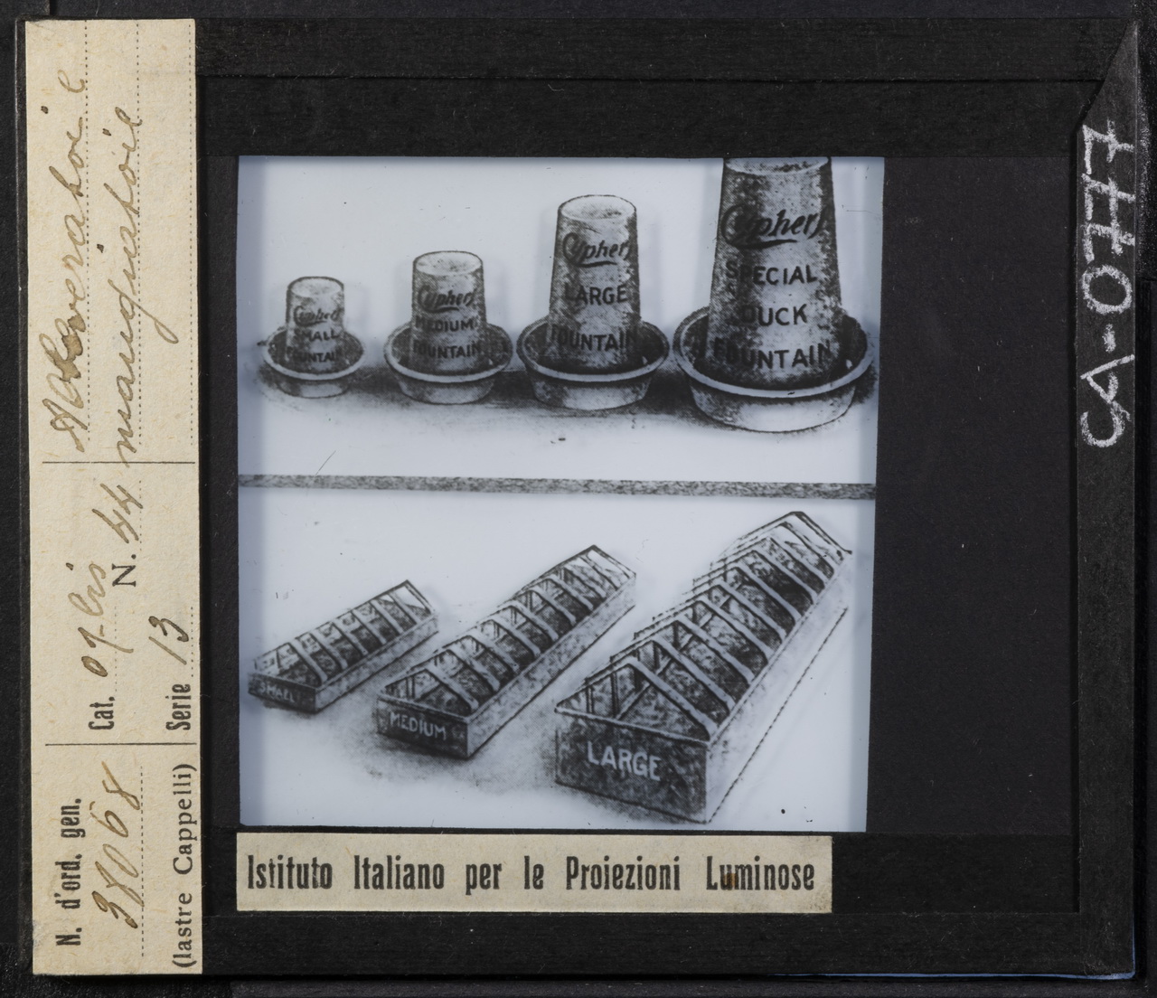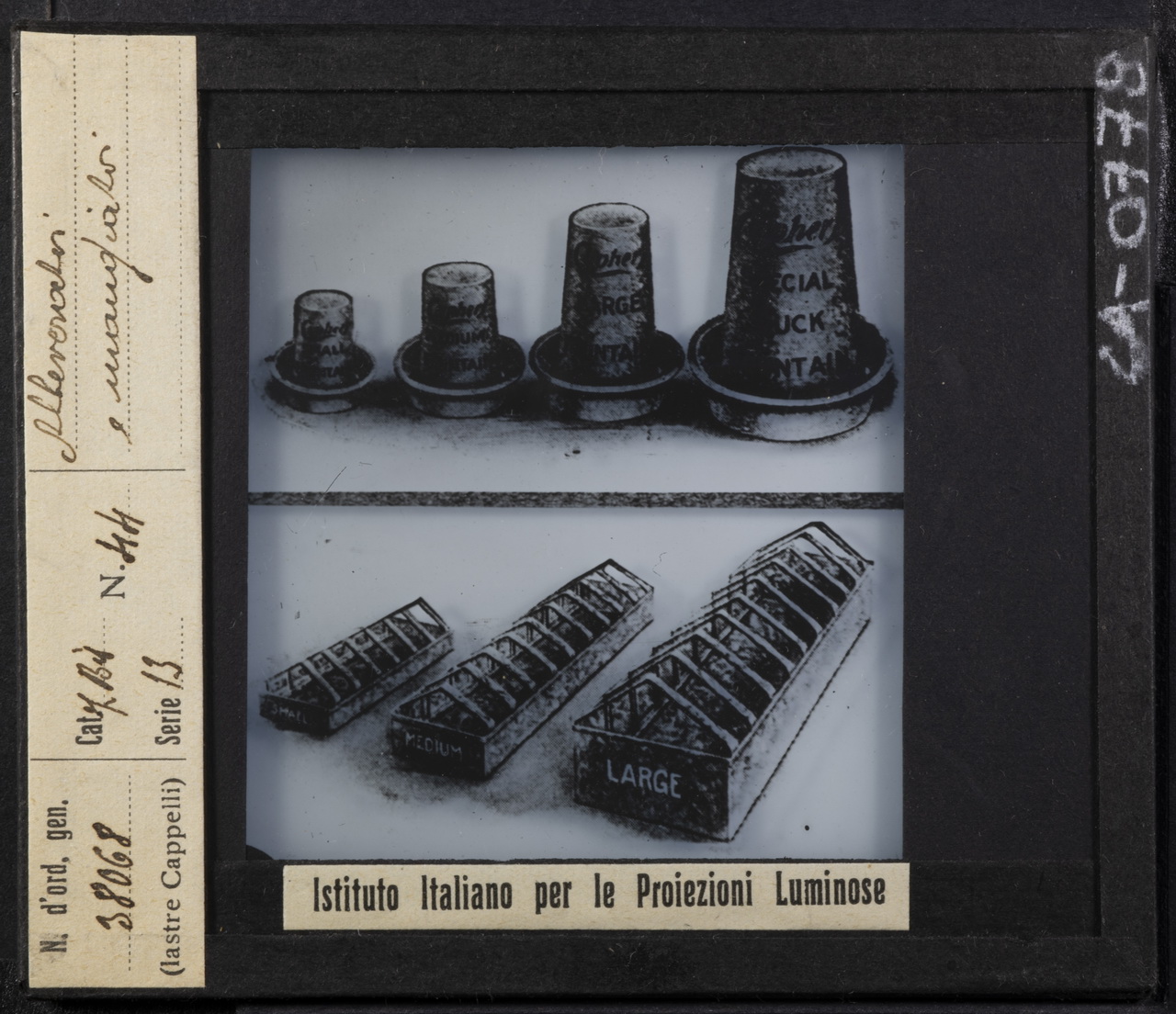 - NOTIZIE STORICO CRITICHE I materiali presenti nel fondo lasciano supporre una riproduzione da positivi o da libri, come spesso si deduce da mascherature che vanno a ricoprire titolazioni originali o dalla presenza di puntine da disegno usate per fissare ad un supporto la fotografia da duplicare. Le diapositive fotografiche su vetro per lanterna magica sono realizzate tra il 1921 e il 1932 a Milano, con riprese eseguite dall’Istituto Italiano per le Proiezioni Luminose (1921-1935 ca.) e lastre prodotte dalla ditta Cappelli (1885-1932), industria di grande rilievo che si impone sul mercato italiano, soprattutto dopo l’avvento della gelatina bromuro d’argento che semplifica il processo di sviluppo e stampa dei negativi e rende possibile una svolta verso l’industrializzazione in campo fotografico. Le speciali proiezioni delle immagini, effettuate con proiettori al carburo (acetilene), illustrano le lezioni di agricoltura e zootecnica che si tengono in modo itinerante in varie località dell’area bolognese. Tali lezioni sono promosse a livello nazionale dalle Cattedre Ambulanti di Agricoltura, una Istituzione nata nella seconda metà dell’Ottocento, quando le università del Paese riescono a formare i primi agronomi e quando si consolidano gli istituti agrari: sono gli uomini formatisi nelle scuole agrarie a guidare le prime cattedre, la loro determinazione porta allo sviluppo dell’agricoltura italiana, il loro scopo iniziale è quello di tenere delle conferenze di “propaganda agricola”, che consentano di diffondere nuove tecniche e raggiungere gli agricoltori anche nelle campagne più sperdute. L’insegnamento delle buone pratiche agricole serve a combattere l’ignoranza e l’isolamento della società rurale, i risultati sono subito tangibili: incremento della produzione agricola e del patrimonio zootecnico, introduzione e diffusione di nuove piante e varietà. La Cattedra Ambulante di Agricoltura di Bologna (in seguito Ufficio provinciale per l’Agricoltura) è attiva dal 1893 al 1935, ne sono presidenti Domizio Cavazza e poi Luigi Zerbini, nella sua genesi ha un ruolo primario il Comizio agrario di Bologna (inaugurato nel 1867, nel 1915 si separa dalla Cattedra) presieduto da Luigi Pizzardi e poi da Enrico Pini. Organi ufficiali del Comizio agrario di Bologna e della Cattedra Ambulante di Agricoltura di Bologna sono i periodici “L’Italia agricola” (1869-1991), “L’agricoltura bolognese” (1907-1929) e gli “Annali della cattedra provinciale di agricoltura e dell’ufficio tecnico del Comizio agrario di Bologna” (1893-1912). Con la legge n. 1220 del 13 giugno 1935 la Cattedra Ambulante di Agricoltura di Bologna viene soppressa e sostituita dall’Ispettorato provinciale di Agricoltura