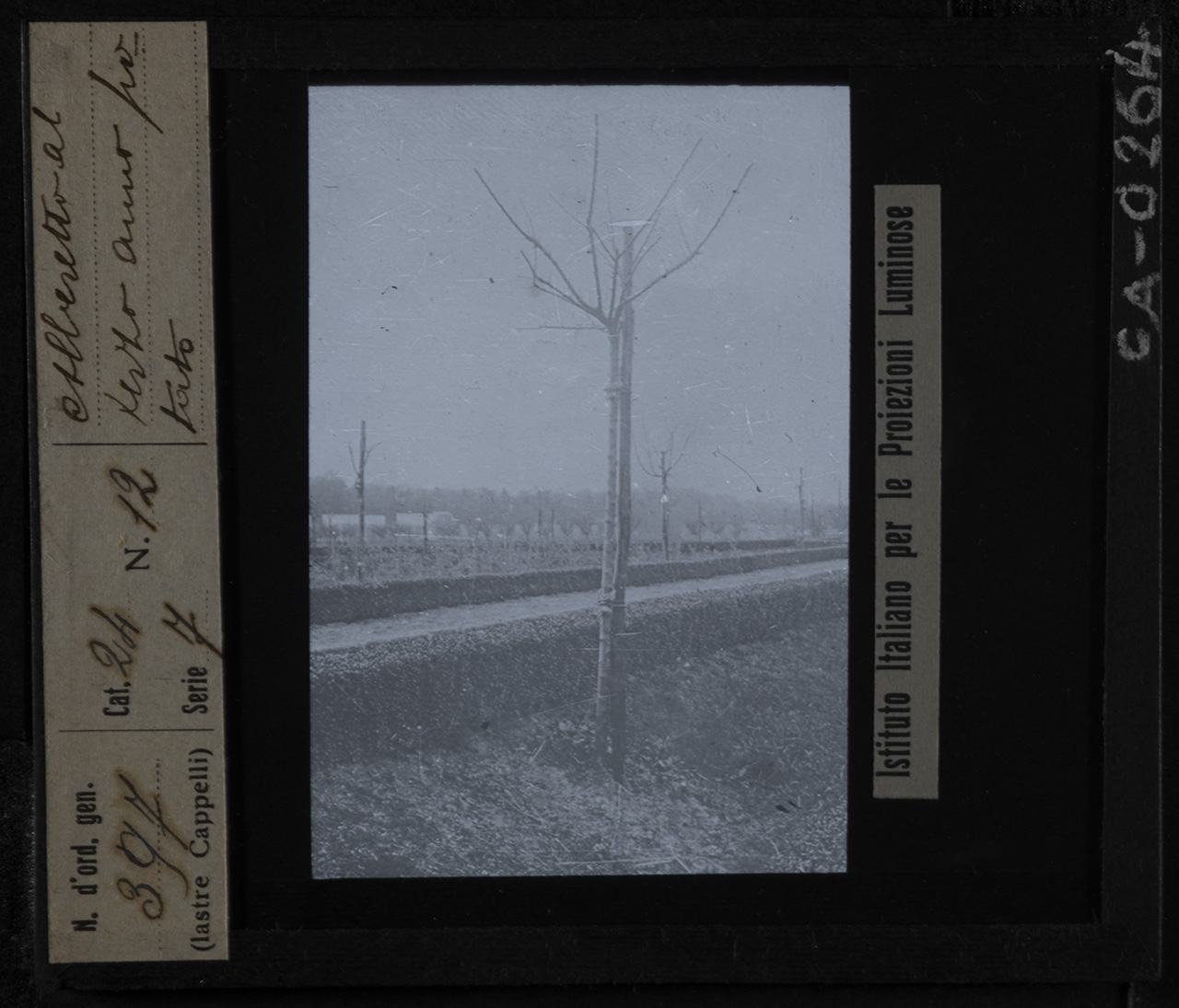 - ISCRIZIONI sull’etichetta: recto: a sinistra - N. d'ord. gen. / 397 / (lastre Cappelli) // Cat. 24 N. 12 / Serie 7 // Alberetto al terzo / anno potato - corsivo -