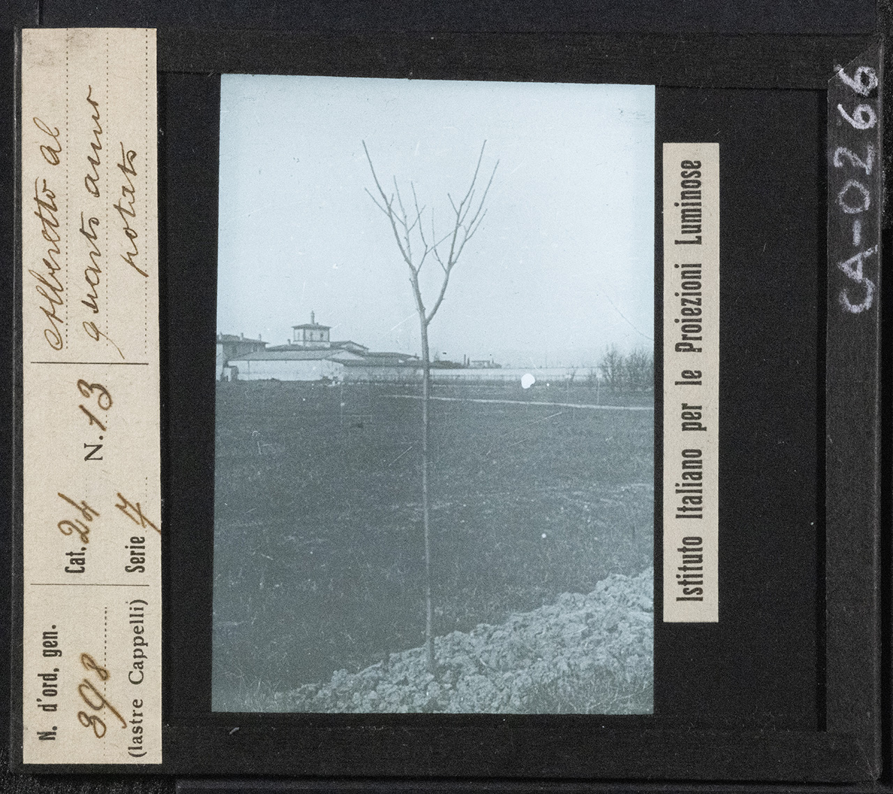 - NOTIZIE STORICO CRITICHE I materiali presenti nel fondo lasciano supporre una riproduzione da positivi o da libri, come spesso si deduce da mascherature che vanno a ricoprire titolazioni originali o dalla presenza di puntine da disegno usate per fissare ad un supporto la fotografia da duplicare. Le diapositive fotografiche su vetro per lanterna magica sono realizzate tra il 1921 e il 1932 a Milano, con riprese eseguite dall’Istituto Italiano per le Proiezioni Luminose (1921-1935 ca.) e lastre prodotte dalla ditta Cappelli (1885-1932), industria di grande rilievo che si impone sul mercato italiano, soprattutto dopo l’avvento della gelatina bromuro d’argento che semplifica il processo di sviluppo e stampa dei negativi e rende possibile una svolta verso l’industrializzazione in campo fotografico. Le speciali proiezioni delle immagini, effettuate con proiettori al carburo (acetilene), illustrano le lezioni di agricoltura e zootecnica che si tengono in modo itinerante in varie località dell’area bolognese. Tali lezioni sono promosse a livello nazionale dalle Cattedre Ambulanti di Agricoltura, una Istituzione nata nella seconda metà dell’Ottocento, quando le università del Paese riescono a formare i primi agronomi e quando si consolidano gli istituti agrari: sono gli uomini formatisi nelle scuole agrarie a guidare le prime cattedre, la loro determinazione porta allo sviluppo dell’agricoltura italiana, il loro scopo iniziale è quello di tenere delle conferenze di “propaganda agricola”, che consentano di diffondere nuove tecniche e raggiungere gli agricoltori anche nelle campagne più sperdute. L’insegnamento delle buone pratiche agricole serve a combattere l’ignoranza e l’isolamento della società rurale, i risultati sono subito tangibili: incremento della produzione agricola e del patrimonio zootecnico, introduzione e diffusione di nuove piante e varietà. La Cattedra Ambulante di Agricoltura di Bologna (in seguito Ufficio provinciale per l’Agricoltura) è attiva dal 1893 al 1935, ne sono presidenti Domizio Cavazza e poi Luigi Zerbini, nella sua genesi ha un ruolo primario il Comizio agrario di Bologna (inaugurato nel 1867, nel 1915 si separa dalla Cattedra) presieduto da Luigi Pizzardi e poi da Enrico Pini. Organi ufficiali del Comizio agrario di Bologna e della Cattedra Ambulante di Agricoltura di Bologna sono i periodici “L’Italia agricola” (1869-1991), “L’agricoltura bolognese” (1907-1929) e gli “Annali della cattedra provinciale di agricoltura e dell’ufficio tecnico del Comizio agrario di Bologna” (1893-1912). Con la legge n. 1220 del 13 giugno 1935 la Cattedra Ambulante di Agricoltura di Bologna viene soppressa e sostituita dall’Ispettorato provinciale di Agricoltura