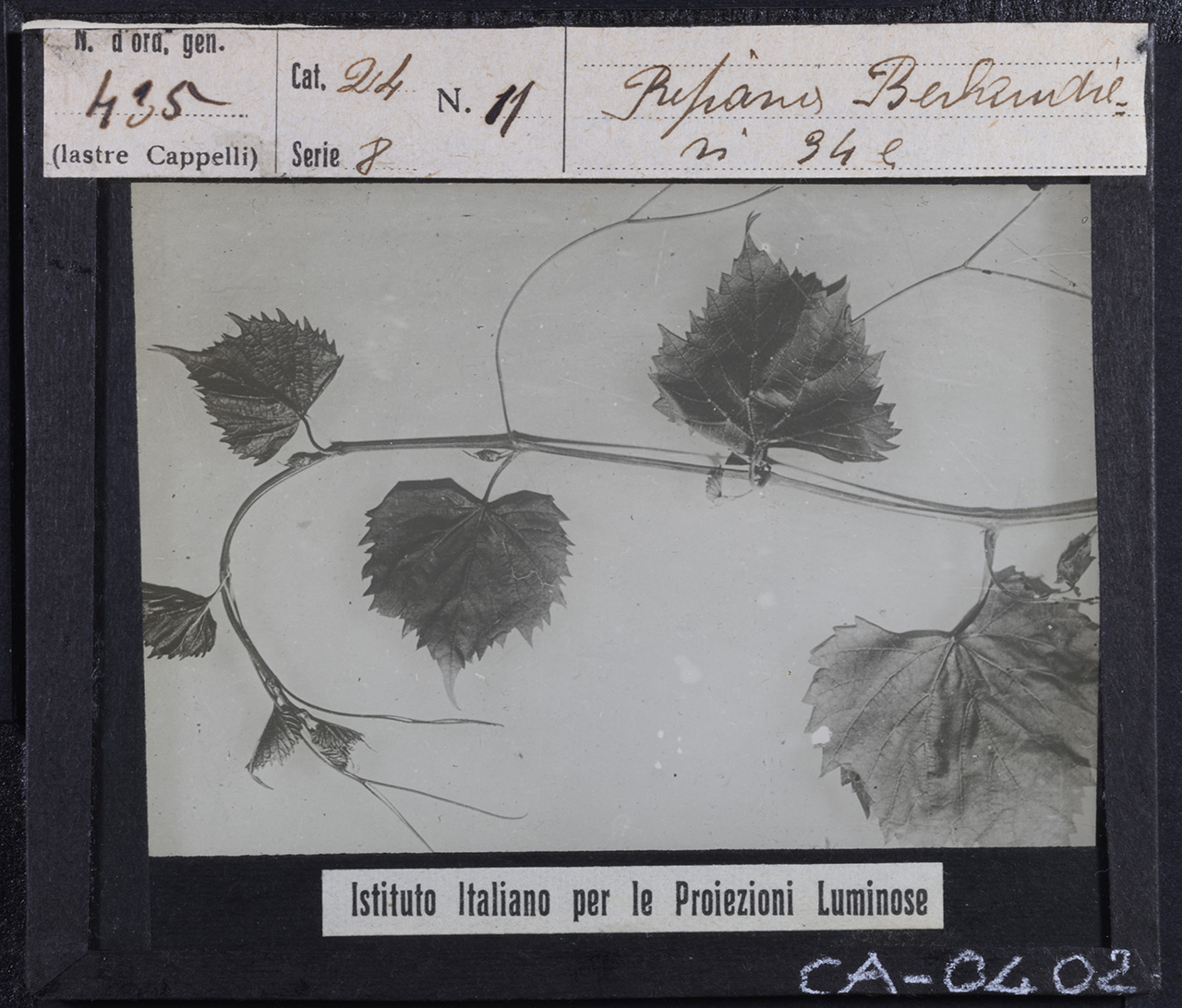 - ISCRIZIONI sull’etichetta: recto: in alto - N. d'ord. gen. / 435 / (lastre Cappelli) // Cat. 24 N. 11 / Serie 8 // Riparia Berlandieri / 34 e - corsivo -