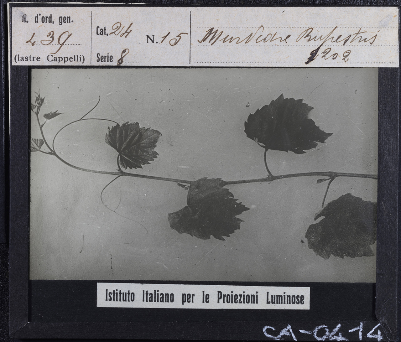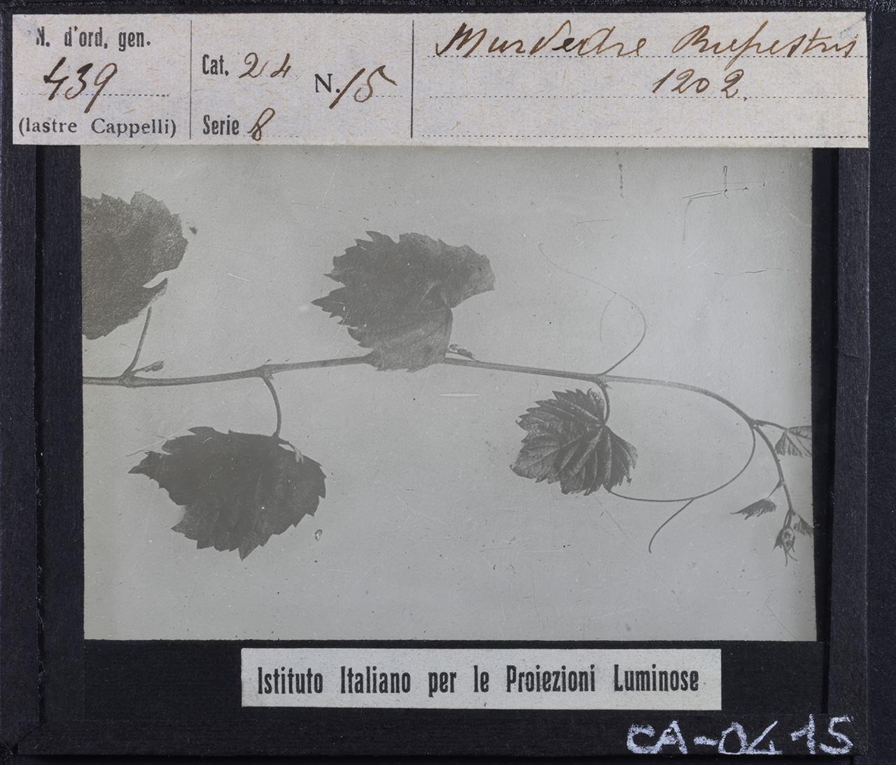 - ISCRIZIONI sull’etichetta: recto: in alto - N. d'ord. gen. / 439 / (lastre Cappelli) // Cat. 24 N. 15 / Serie 8 // Murvedre [sic] Rupestris / 1202 - corsivo -