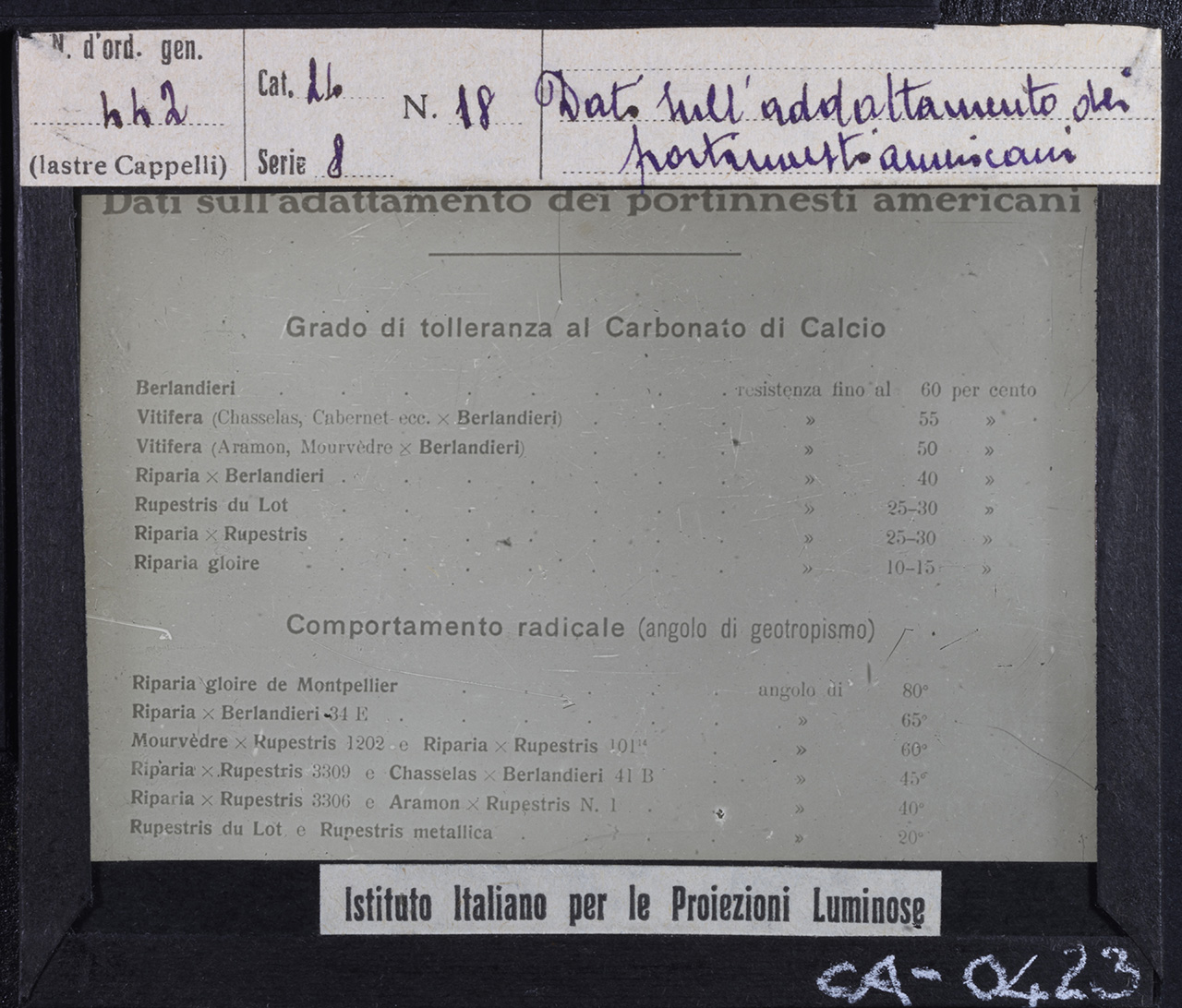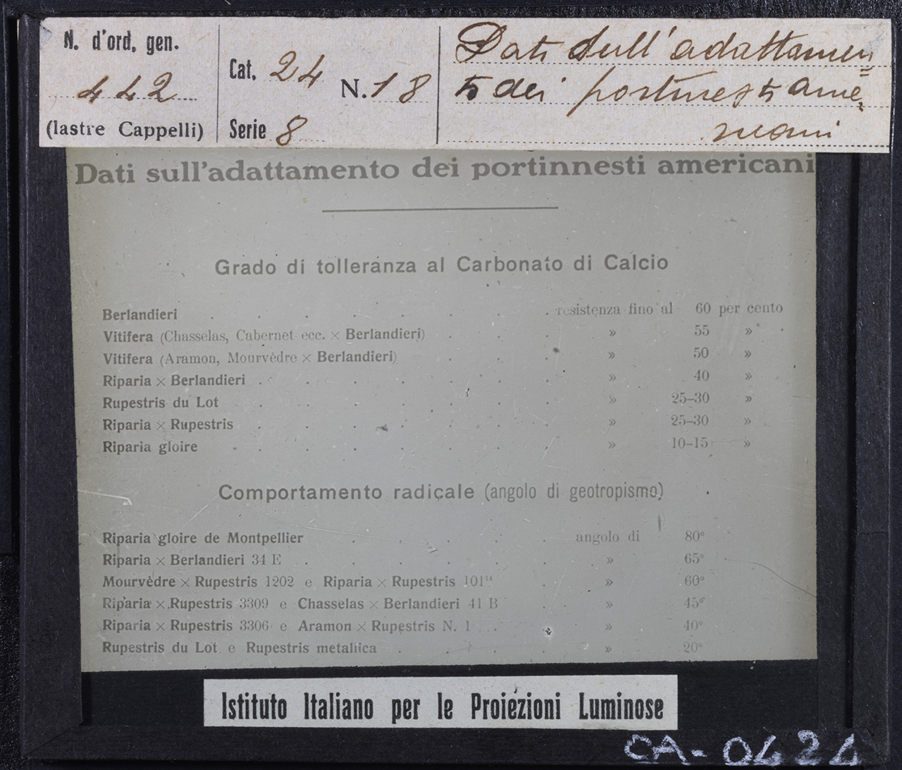 - ISCRIZIONI sull’etichetta: recto: in alto - N. d'ord. gen. / 442 / (lastre Cappelli) // Cat. 24 N. 18 / Serie 8 // Dati sull'adattamen= / to dei portinesti ame= / ricani - corsivo -
