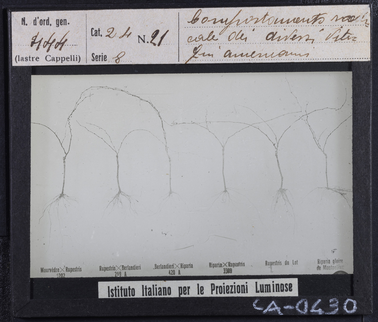 - ISCRIZIONI sull’etichetta: recto: in alto - N. d'ord. gen. / 444 / (lastre Cappelli) // Cat. 24 N. 21 / Serie 8 // Comportamento radicale / dei diversi vitigni americani - corsivo -