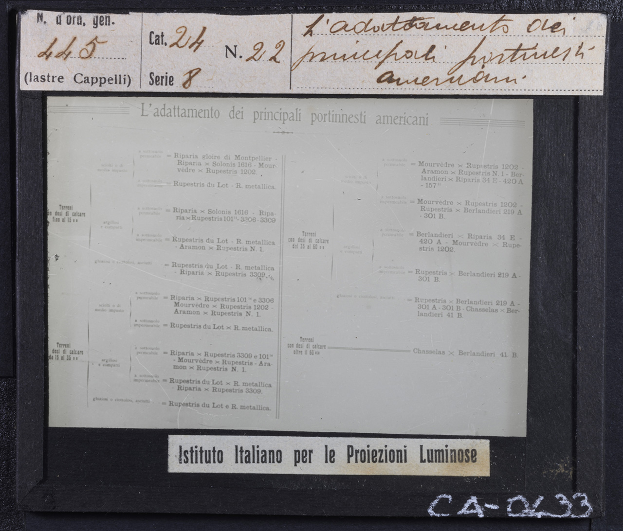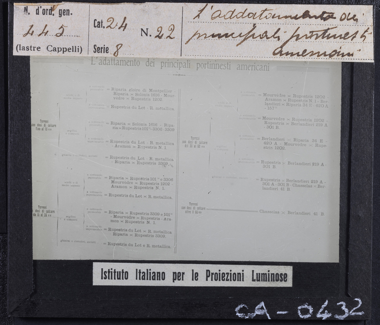 - ISCRIZIONI sull’etichetta: recto: in alto - N. d'ord. gen. / 445 / (lastre Cappelli) // Cat. 24 N. 22 / Serie 8 // L'addattamento [sic] dei principali / portinnesti americani - corsivo -