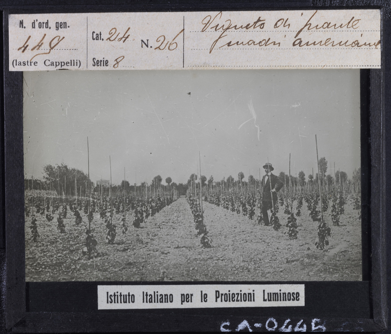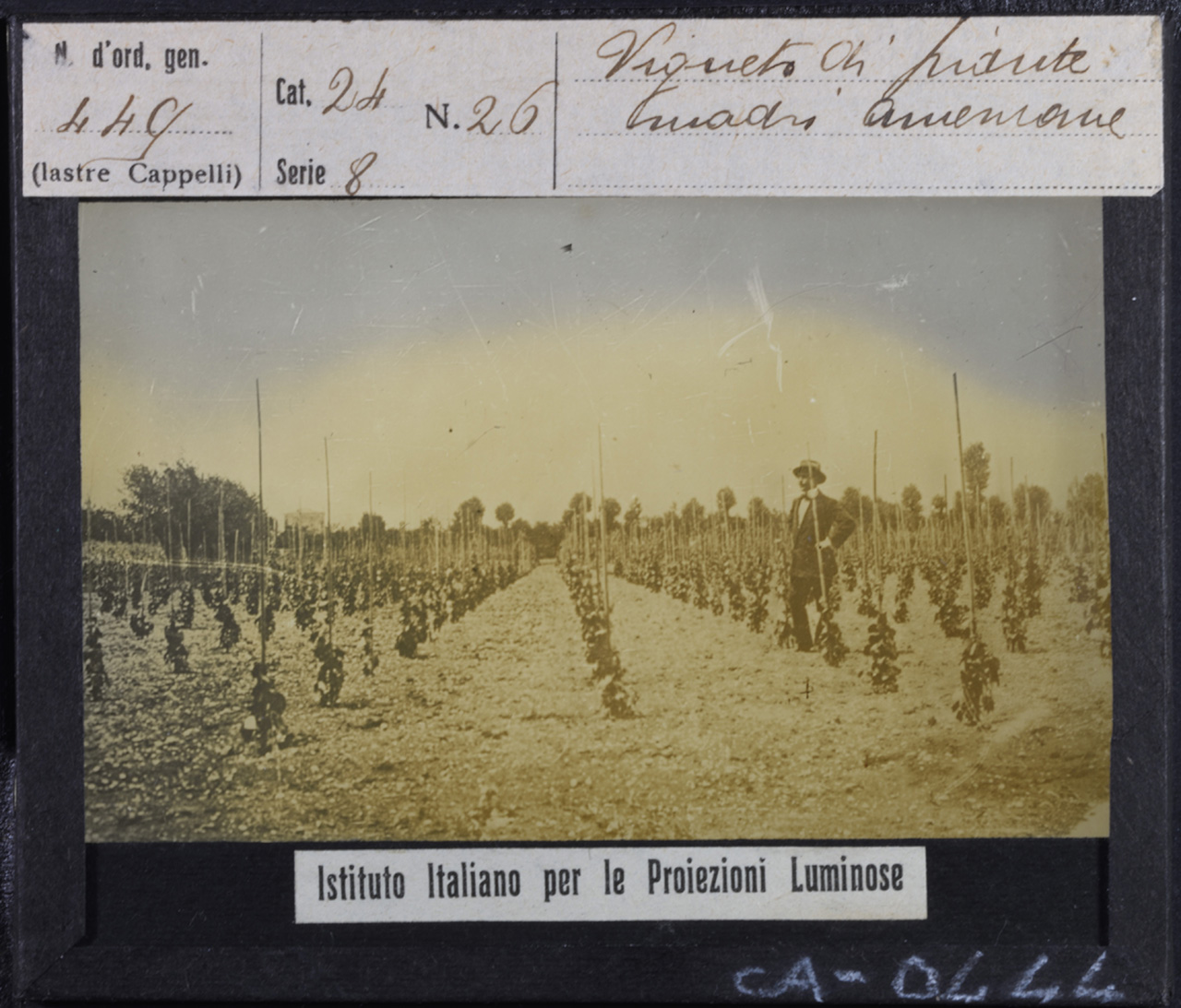 - ISCRIZIONI sull’etichetta: recto: in alto - N. d'ord. gen. / 449 / (lastre Cappelli) // Cat. 24 N. 26 / Serie 8 // Vigneto di piante madri / americane - corsivo -