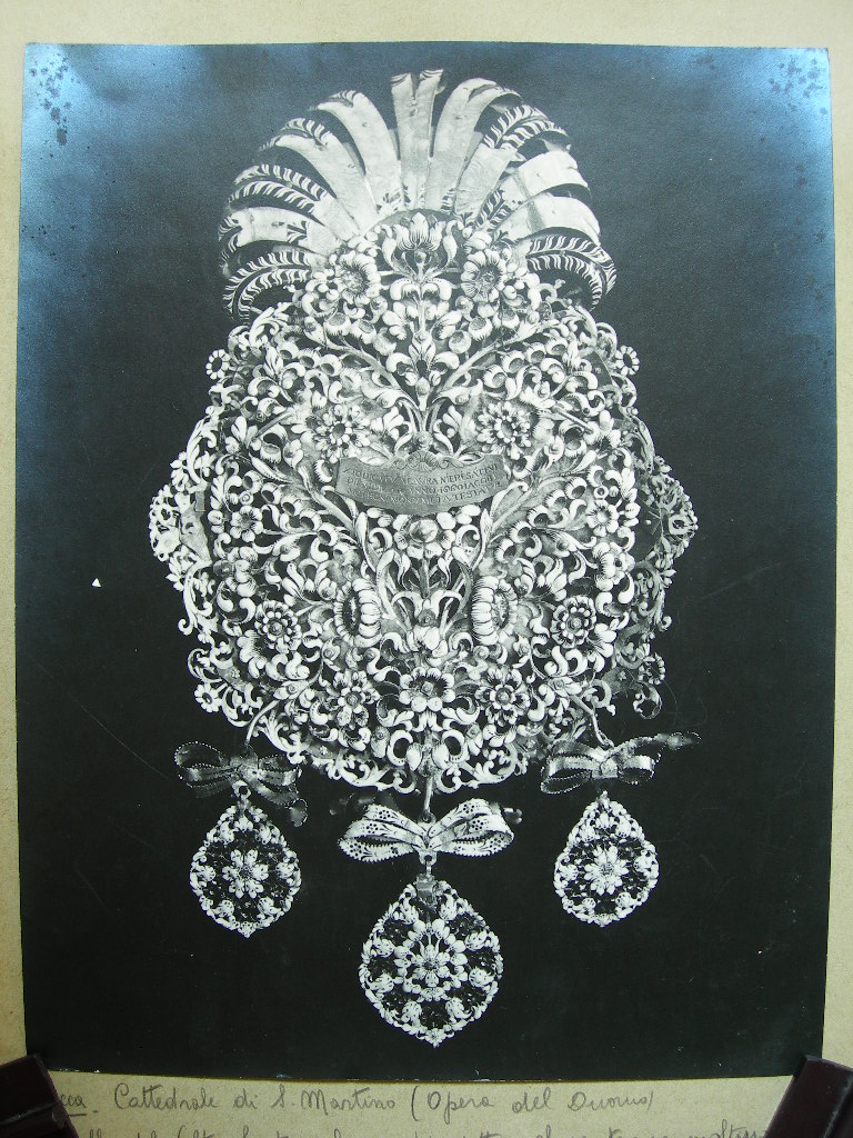 Lucca. Cattedrale di S. Martino (Opera) Gioiello del Volto Santo a forma di rosetta nel centro con moltissimi brillanti e smalti bianchi e neri dorato da Laura Santini nel 1660 opera di orafo della prima metà del XVII sec. Foto Sopr. Firenze 12582