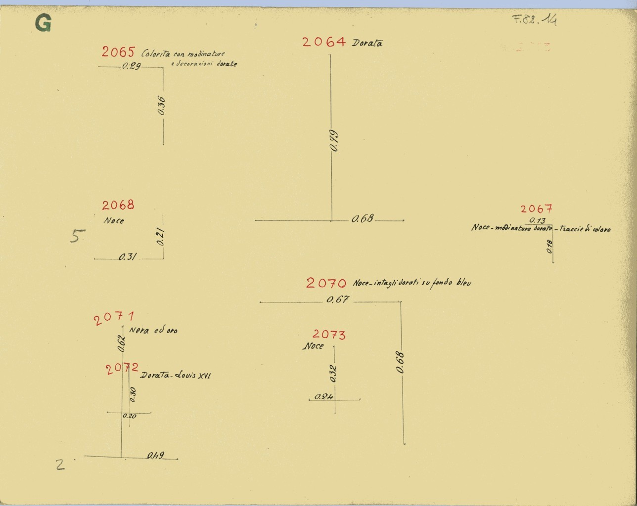 busta telata (cm. 20.5 x 28), ingiallita, consumata ai bordi e in parte lacerata. Sulla parte anteriore, lungo il bordo inferiore, impressa a inchiostro blu la scritta " CORNICI 2". All'interno 28 foto di cornici