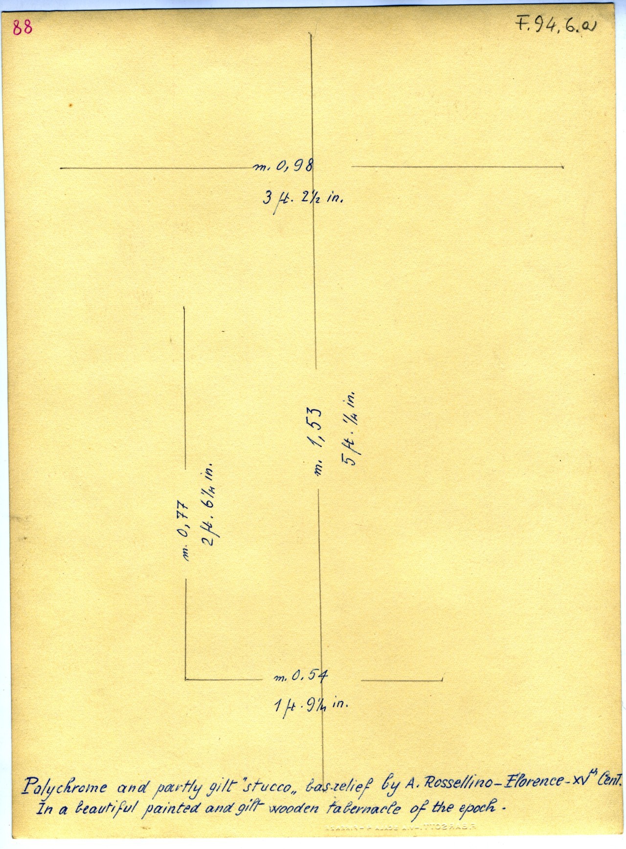 busta telata (cm. 21 x 29), ingiallita e consumata agli angoli. Sulla fronte, un taglio obliquo. Sulla parte anteriore, lungo il bordo inferiore, impressa a inchiostro blu la scritta "STUCCHI". All'interno, 14 foto di rilievi con soggetti sacri e profani