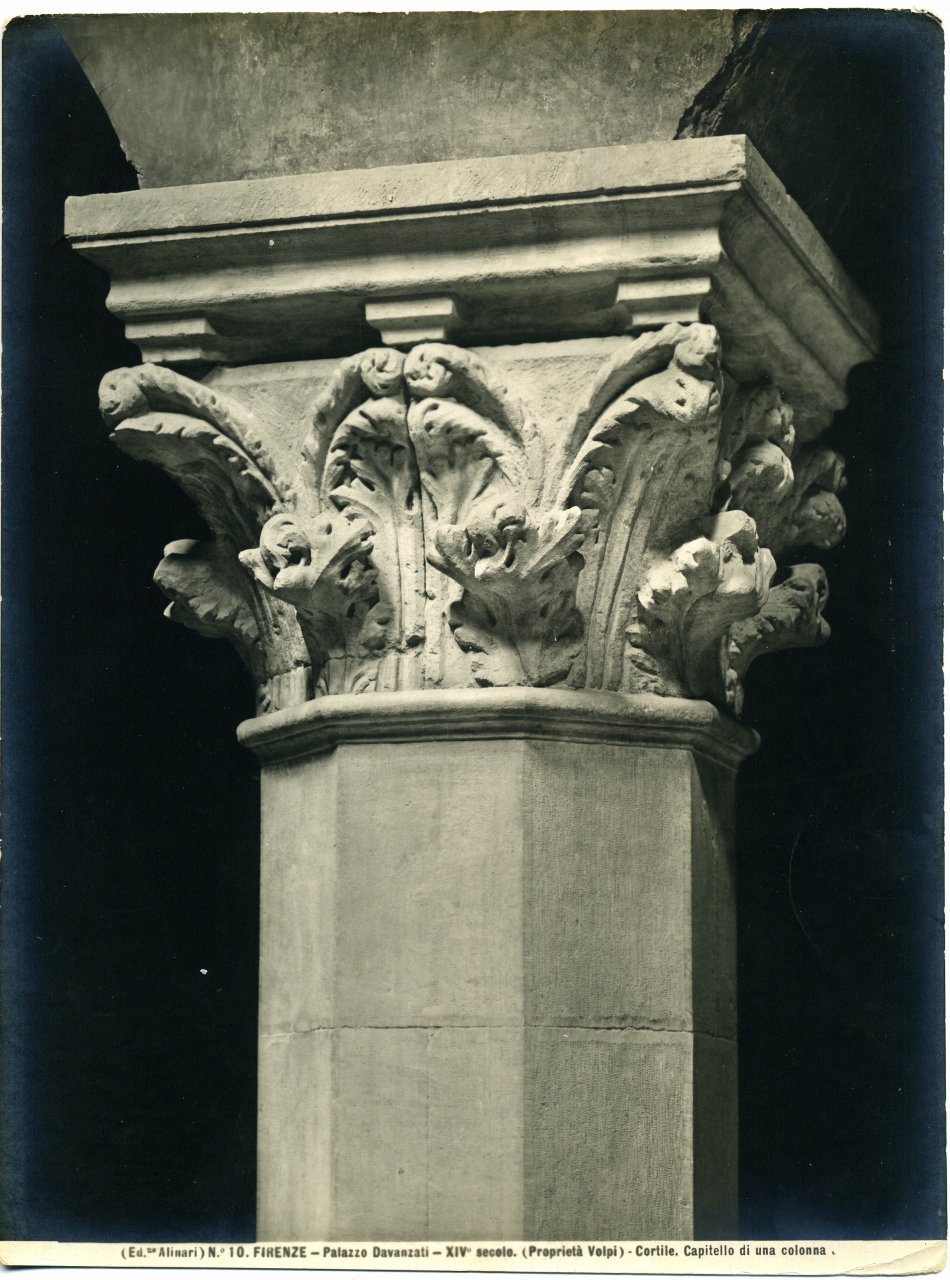 - ISCRIZIONI Sul supporto primario: recto: in basso - (Ed. ne Alinari) N.° 10. FIRENZE - Palazzo Davanzati - XIV° secolo. (Proprietà Volpi) - Cortile. Capitello di un colonna - fotografica -