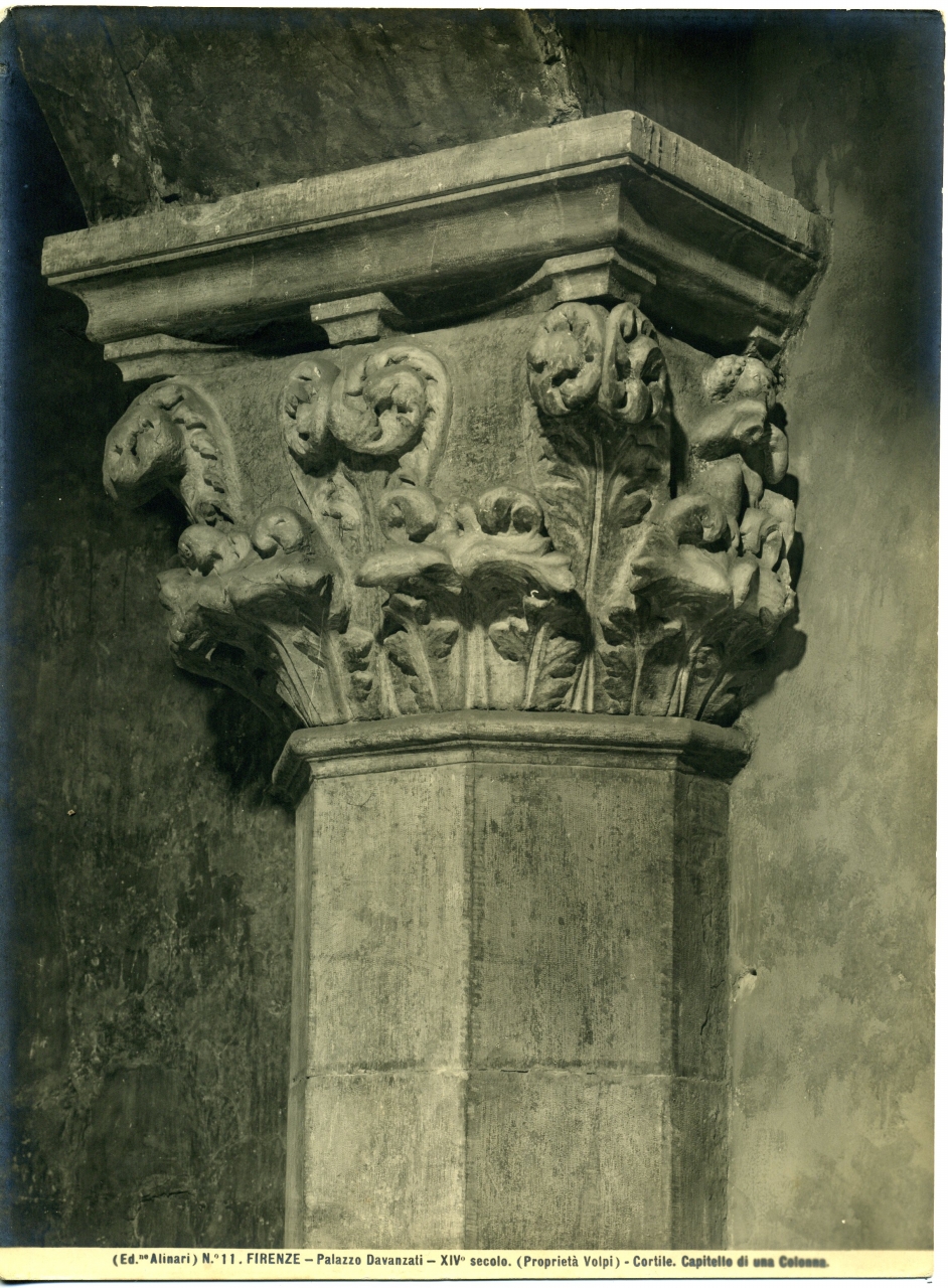 - ISCRIZIONI Sul supporto primario: recto: in basso - (Ed. ne Alinari) N.° 11. FIRENZE - Palazzo Davanzati - XIV° secolo. (Proprietà Volpi) - Cortile. Capitello di una Colonna - fotografica -