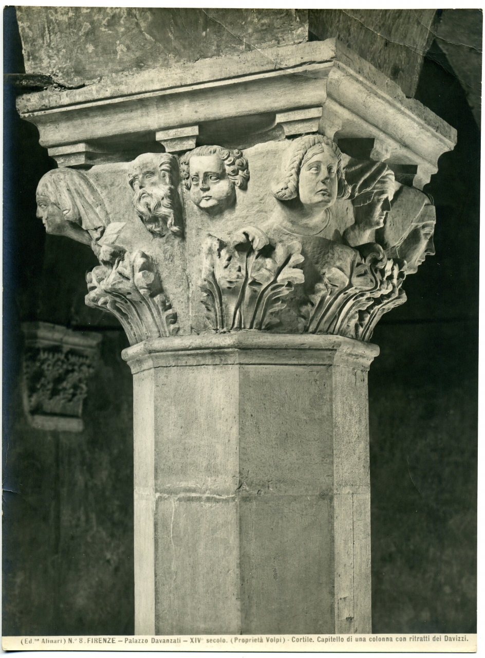 - ISCRIZIONI Sul supporto primario: recto: in basso - (Ed. ne Alinari) N.° 8. FIRENZE - Palazzo Davanzati - XIV secolo. (Proprietà Volpi) - Cortile. Capitello di una colonna con ritratti dei Davizzi - fotografica -