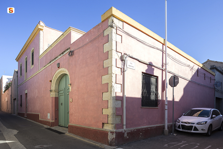 casa a corte su lotto rettangolare di circa 21 per 22 metri, posta in posizione d'angolo e delimitata da un alto muro intonacato e tinteggiato, entro cui si apre il portale ad arco policentrico ribassato realizzato con conci lapidei. Attorno a tutto il perimetro si attestano edifici ad uno e due piani. I conci lapidei squadrati segnano anche l'angolo del muro. Il fabbricato principale padronale è su due piani, ha una pianta a L misura circa 12 per 13 metri e presenta un prospetto su strada contenuto da pilastri angolari in mattoni di laterizio, fascia marcapiano decorata, finestre con cornice modanata, porta con piattabanda lapidea e cornicione di coronamento modanato e aggettante. Il fabbricato si apre sulla corte interna attraverso una loggia porticata avente copertura piana terrazzata. L'edificio ha basamento in pietrame, murature in ladiri intonacate e rinforzate da mattoni laterizi o conci in calcare nelle parti speciali. La copertura dell'edificio è a falde e il tetto a tegole.
