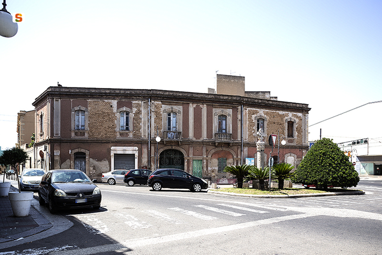 edificio di tipologia a palazzo, a due piani e corte retrostante, realizzato con murature portanti in #ladiri# e copertura, con tetto a due falde, in coppi. L'edificio insiste su un lotto poligonale di cui tre lati affacciano su strada, le dimensioni sono di circa 30 m lungo la piazza Azuni, 7 m a sinistra lungo la via Bonaria e 15 m a destra lungo la via Marconi. I prospetti sono scanditi dal basamento in pietra, fascia marcapiano e cornicione di coronamento, sono intonacati con intonaco di calce e sabbia ed sono ricchi di lesene e decorazioni in stile liberty; nella parte centrale della facciata sono presenti due balconi con balaustre e mensole in cemento, gli infissi sono in legno; il portale in ferro battuto, nasconde un androne completamente affrescato, sia nelle pareti che nel soffitto. (segue in OSS)