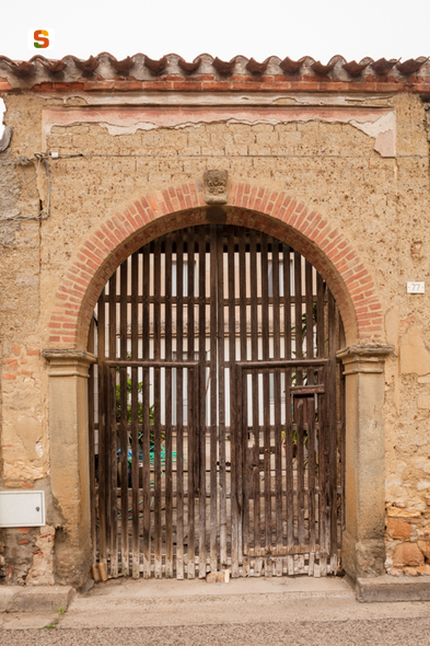 ubicato nel centro di San Gavino Monreale, il bene è uno dei portali storici del paese. Si tratta di un portale ligneo a doppia anta a protezione di un'apertura ad arco a tutto sesto. L'arco è in mattoni di laterizi rossi posati a due teste, mentre la chiave di volta con decoro fitomorfo e i piedritti sono pezzi monolitici di trachite. La struttura è coperta da una falda inclinata sorretta da muratura in #ladiri#, ed il colmo è protetto da un muretto rivestito nella parte superiore da coppi in laterizio. Il portale ha una struttura dei battenti a doghe verticali semiaccostate ad aria passante, montate su un telaio interno e presenta superfici non trattate. Due cornici, in parte scomparse, in rilievo delimitano il profilo di due rettangoli, di cui uno destinato ad ingresso pedonale. Il portale ha affaccio diretto su strada per un'altezza di 3,30 metri per 2,40 di larghezza.