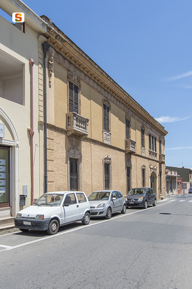 edificio a corte interna articolato in più corpi di fabbrica. La casa padronale a sud si sviluppa su due livelli fuori terra per quasi 8 metri e si affaccia per 26 metri lungo la via Cagliari e per 8 sul corso Gramsci raccordati all'angolo da un settore circolare; la struttura è in muratura di pietrame e laterite. I solai sono composti da un orditura di travetti in legno sormontati da un tavolato; la copertura è a doppia falda e a padiglione per il corpo sul corso Gramsci. Il corpo magazzino sul lato opposto si sviluppa su due livelli e presenta analoghe caratteristiche costruttive. Un ricco ed articolato apparato decorativo in stile Liberty esalta i due sontuosi prospetti: motivi Liberty nei parapetti, nei balconi e nelle finestre timpanate con protome femminili, un ingresso carraio sormontato da una neorinascimentale trifora, modanate linee di marcapiano, clipei e trabeazione lungo il cornicione in sommità; aggettanti telamoni angolari scandiscono l'alternanza delle stagioni.