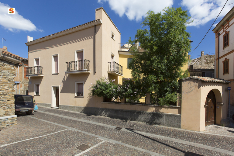 l'edificio ha due piani (e sottotetto) ed è coperto da tetto a doppia falda e manto di tegole in coppi. Presenta più corpi di fabbrica che si aggregano, con forme che si adattano alla conformazione dell'isolato. Gli spazi di pertinenza aperti, sono comunitari alle corti delle case vicine. L'edificio, è alto 8.50 m ca., con il prospetto principale lungo 12 m ca. Le murature sono in pietra di scisto locale, con intonaci a base di cemento e pittura superficiale color ocra. Il prospetto principale, simmetrico, ha porte (con balcone e ringhiera metallica, una esclusa) e finestre, tutte rifinite con una semplice cornice, come il cornicione. I prospetti laterali, alti e lunghi con terminazione orizzontale, presentano una fila di bucature centrale, priva di decorazioni. All'interno il piano terra è caratterizzato da archi a tutto sesto e sesto ribassato, gli orizzontamenti sono in legname in tutti i livelli; al p.t. conserva tratti di pavimentazione con selciato (negli spazi aperti e chiusi).