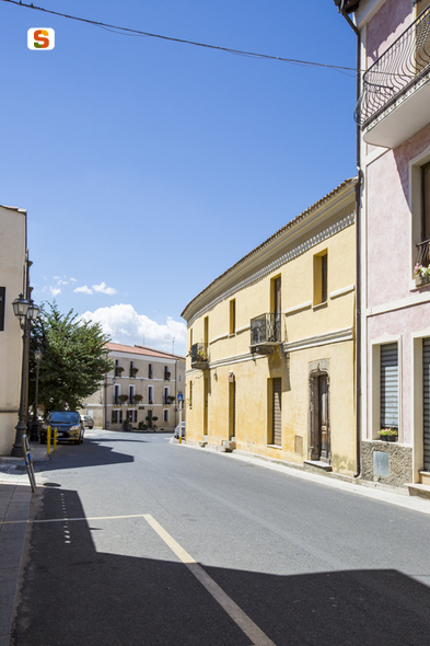 l'edificio si sviluppa su due piani, a partire da una planimetria (di circa 160 mq) a forma di L che, addossata ad altri edifici, va a definire una corte chiusa, alla quale si accede dal portale ubicato nel prospetto O laterale (impreziosito da scanalature nell'intonaco). Presenta un prospetto principale lungo 23.30 m ca. (alto circa 8 m) e un prospetto laterale lungo 8 m ca. Il prospetto principale ha subito alcune modifiche di alcune bucature del piano terra (in seguito alla mutata destinazione d'uso degli ambienti interni), mentre conserva un'elegante porta in trachite lavorata, in stile gotico-aragonese, non alterata. Degne d'attenzione le mensole che sorreggono i due piccoli balconi e interrompono la lunga fascia marcapiano (e l'altra poco più in alto) che corre lungo tutto il prospetto principale: ciascuna di esse rappresenta un diverso animale o simbolo, ben scolpito in ogni dettaglio. L'edificio è coperto da un tetto a padiglione con manto di coppi.