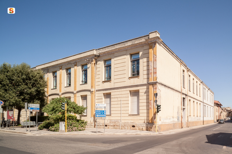 edificio scolastico a due livelli, sorto in un'unica soluzione con impianto planimetrico a C, salvo un ampliamento di circa 21 metri dell'ala destra che ha reso asimmetrica la distribuzione complessiva del bene sul lotto di 35 per 50 metri. L'edificio, alto circa 10 metri, si presenta con un corpo SO longitudinale con copertura a padiglione, affiancato ai lati del lotto da due ali di 13 per 11 metri ciascuna, con coperture a capanno. Un corridoio voltato a botte ribassata, di collegamento alle due ali, oltre a due opposte rampe di scale servono l'intero edificio. Il prospetto principale SO è caratterizzato da una parte centrale leggermente avanzata rispetto ai lati, evidenziata da 5 lesene tra le quali si intercalano sottili archi ribassati in corrispondenza della fascia marcapiano, che invece prosegue rettilinea ai lati. I due ordini sul fronte hanno 8 finestre per piano, per le aule, mentre le due ali hanno 5 aperture per piano distribuite a N a partire dall'asse del corridoio.