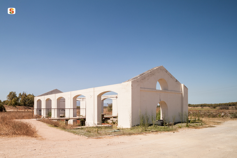 l'edificio, oggi un giardino a cielo aperto, come ogni opera di tipo archeoindustriale è improntata alla funzionalità ed essenzialità della composizione architettonica. Esso è composto da un parallelepipedo a 5 campate ad archi ribassati speculari e ad aria passante, coperto un tempo da un tetto a capanno in tegole di laterizio e struttura lignea a capriate. Le vaschette si distribuiscono sull'asse centrale. I prospetti NE e SO, sono caratterizzati da una fascia marcapiano e da una lunetta centrale sotto la quale si trova un'apertura ad arco a tutto sesto. Un riporto di terra, forse intenzionale, mostra l'edificio in una depressione e il recupero dell'edificio ha previsto, per superare questo, una passerella in legno e acciaio. Tale struttura attraversa ortogonalmente l'edificio in corrispondenza della seconda campata a destra guardando da S. Una volta arrivati all'interno del lavatoio, la passerella muta in parte in due sedute simmetriche che orientano la vista verso Monte Arcuentu.