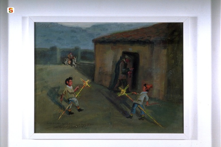 Giochi infantili nell'Ottocento. scena campestre con figure