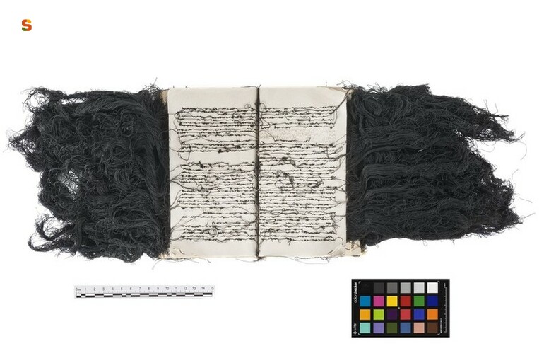 Libro scalpo. libro aperto con fili neri
