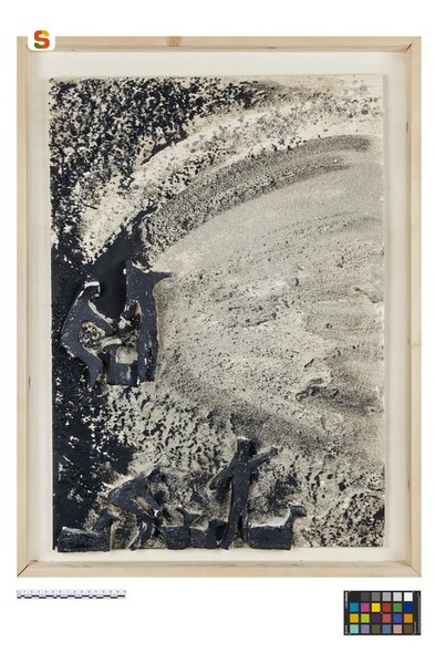 sabbia/ incollaggio// terracotta/ scultura/ pittura// tavola/ inchiostro di china