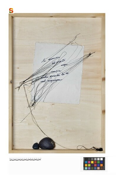 tavola// tela/ incollaggio// tela/ pennarello// filo di cotone// pietre