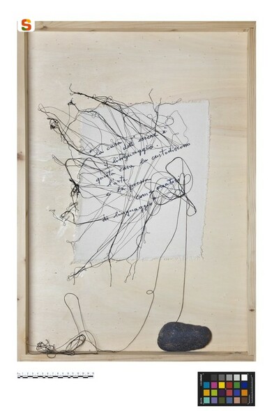 tavola// tela/ incollaggio/ pennarello// filo di cotone/ ricamo su tela// pietra