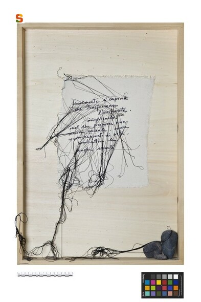 tavola// tela/ incollaggio/ pennarello// filo di cotone/ ricamo su tela// pietre