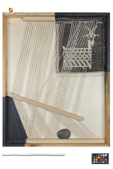tavola/ pittura// filo/ tessitura a telaio// legno// pietra// filo