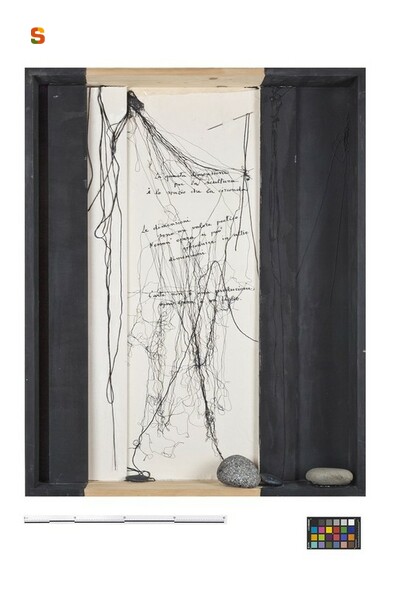 tavola/ pittura a tempera// tela/ incollaggio/ pennarello// filo di cotone/ ricamo su tela// pietre// ago