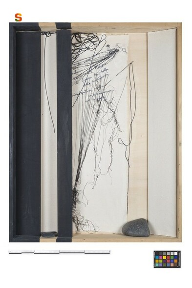 tavola/ pittura a tempera// tela/ incollaggio/ pennarello// filo di cotone/ ricamo su tela// pietre// ago
