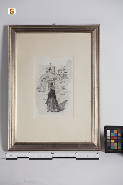 figura femminile in costume tradizionale e architettura religiosa