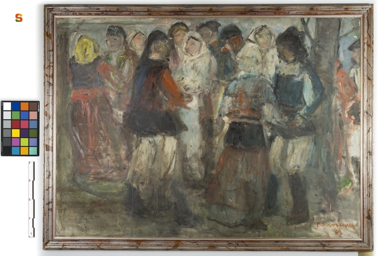 Ballo sardo. figure in costume tradizionale impegnate in un ballo popolare