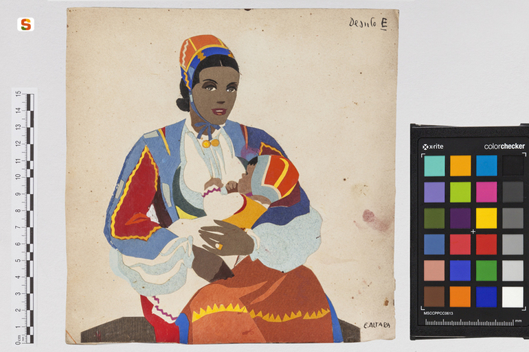 Donna di Desulo che allatta. figura femminile in costume popolare sardo con bambino
