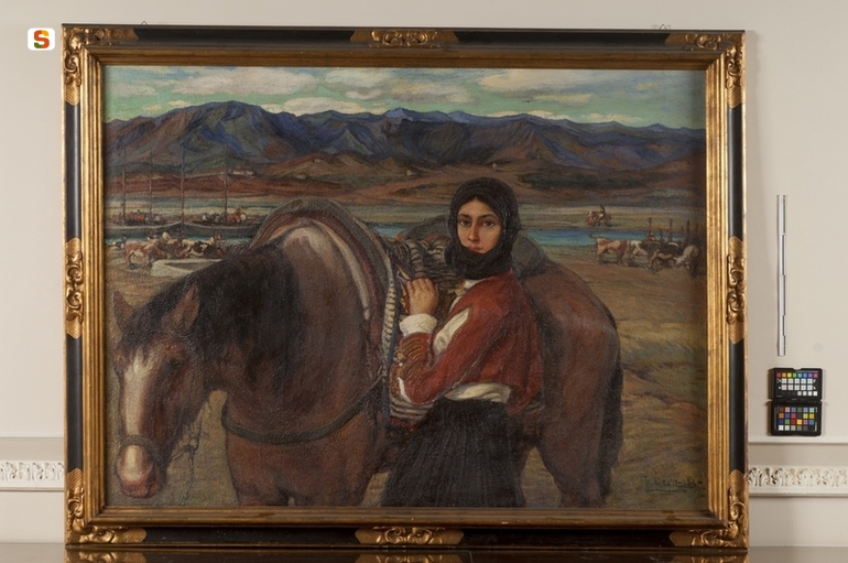 Mujer de Cerdeña (All'abbeveratoio). paesaggio ideale con figura femminile e cavallo in primo piano