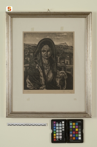 Luci d'Oliena. ritratto di figura femminile con veduta di Oliena