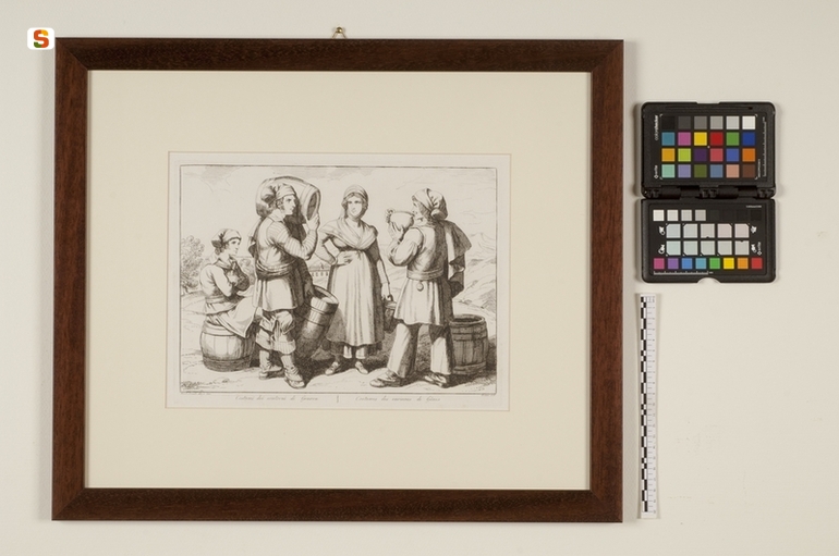 Costumi dei contorni di Genova. figure maschili e femminili in costume popolare genovese