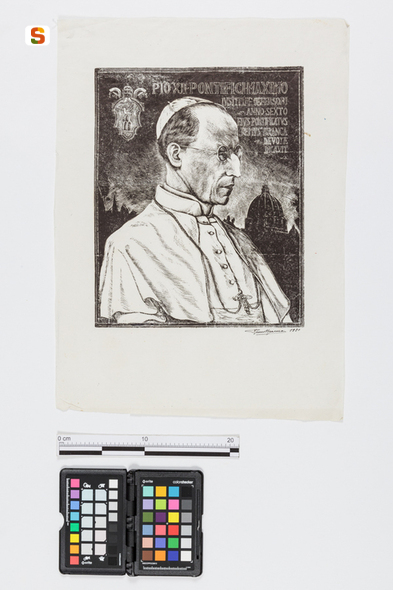 Pio XII Pontifici Maximo. ritratto di papa Pio XII con stemma pontificio e veduta della basilica di San Pietro