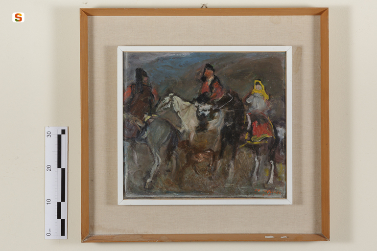 Cavalcata. figure maschili e femminili a cavallo