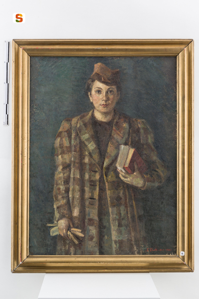 Tina, la sorella dell'artista, con libri e bustina. figura femminile