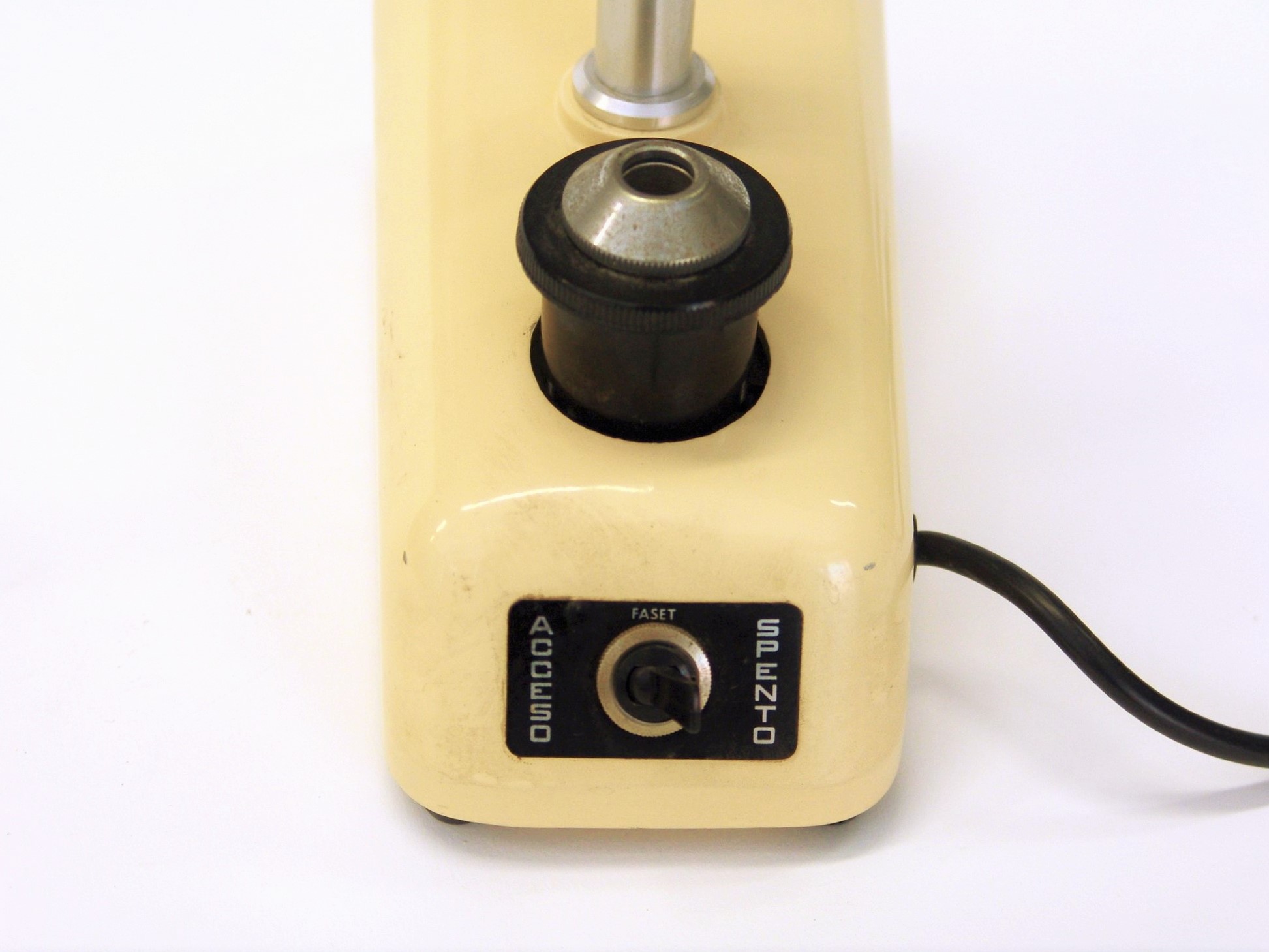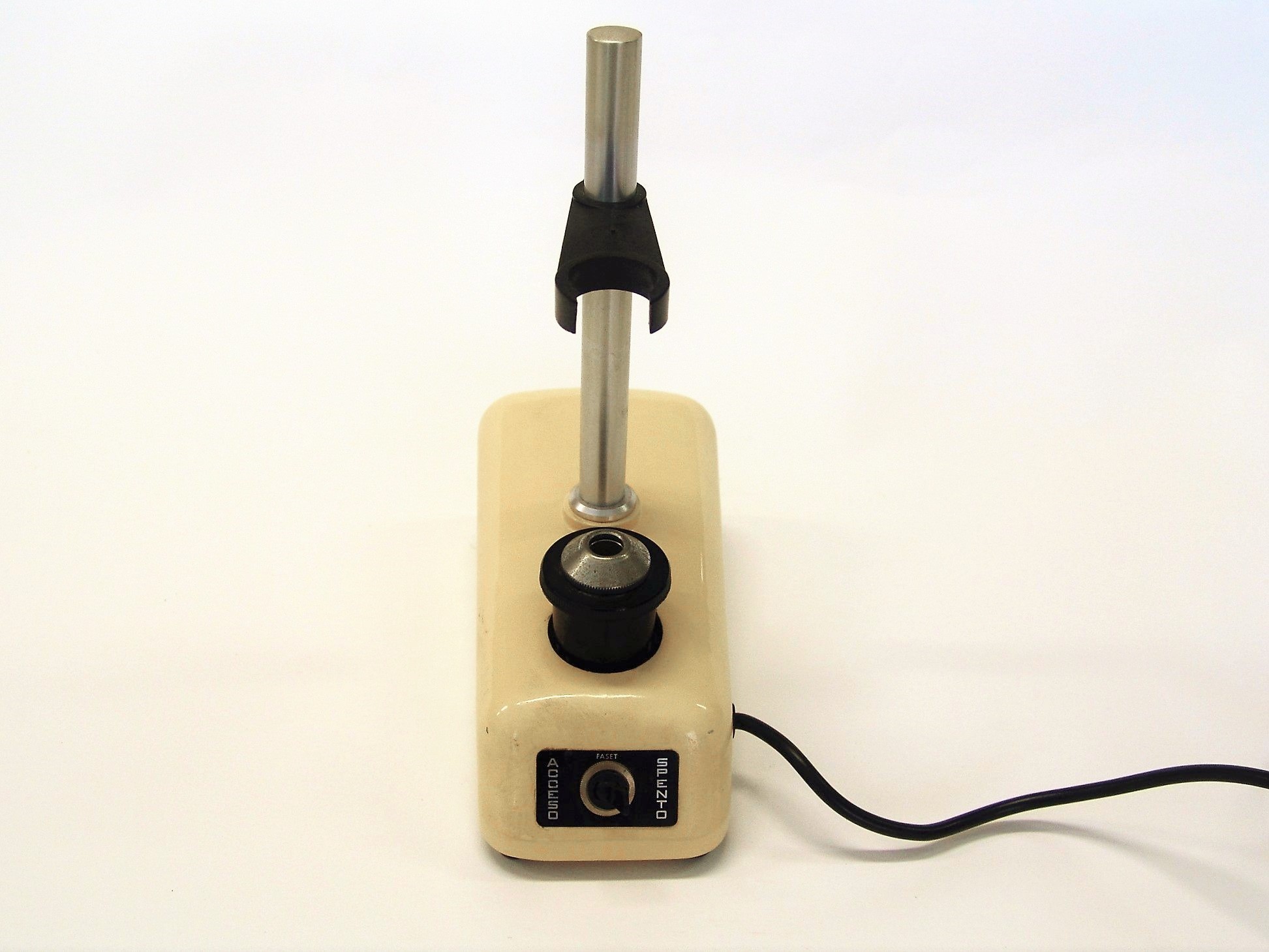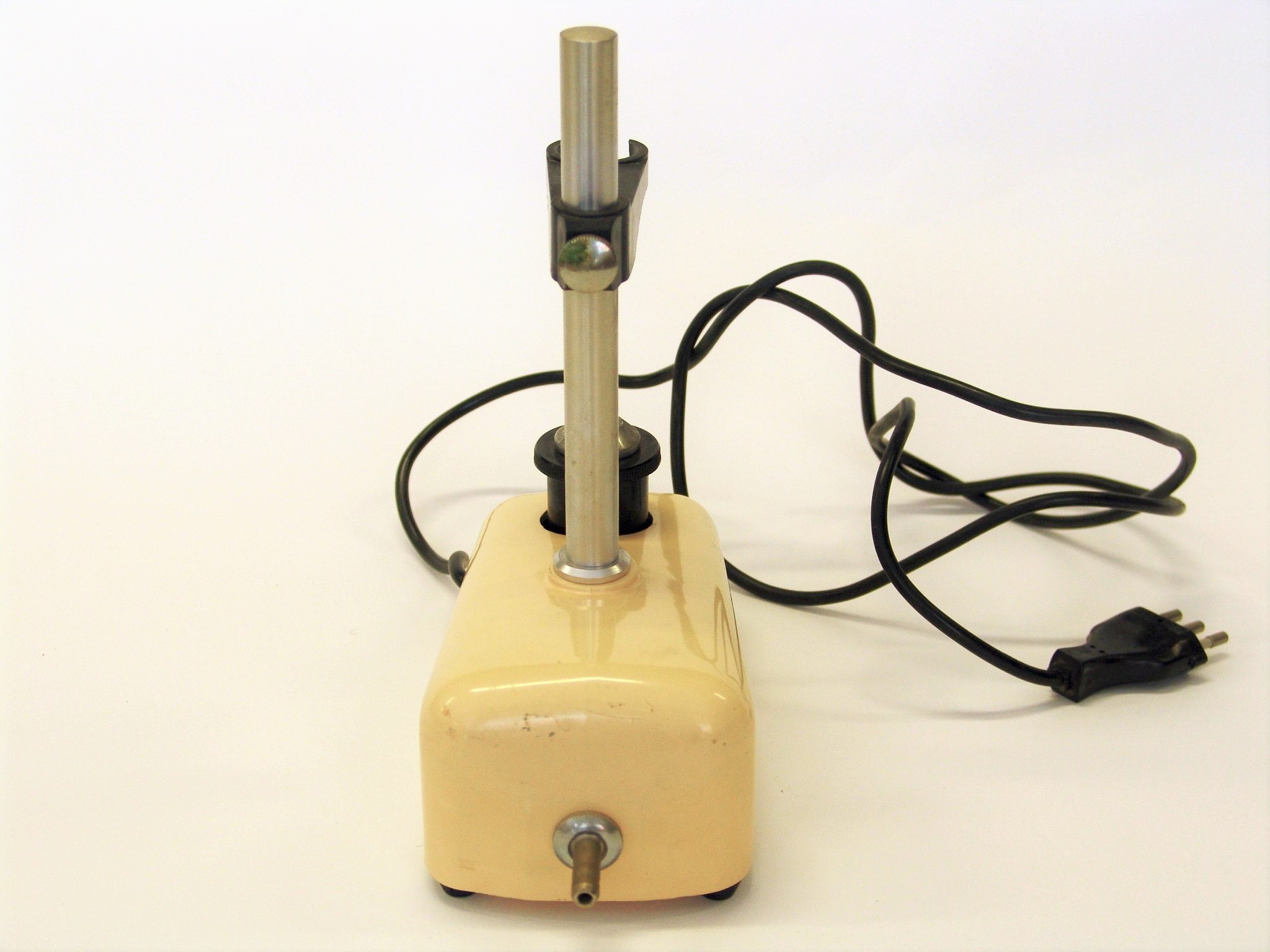 apparecchio elettrico con sostegno e raccordo per tubo e ampolla (mancanti); pompetta a per e ampolla a due uscite, probabilmente non appartenenti a questa attrezzatura
