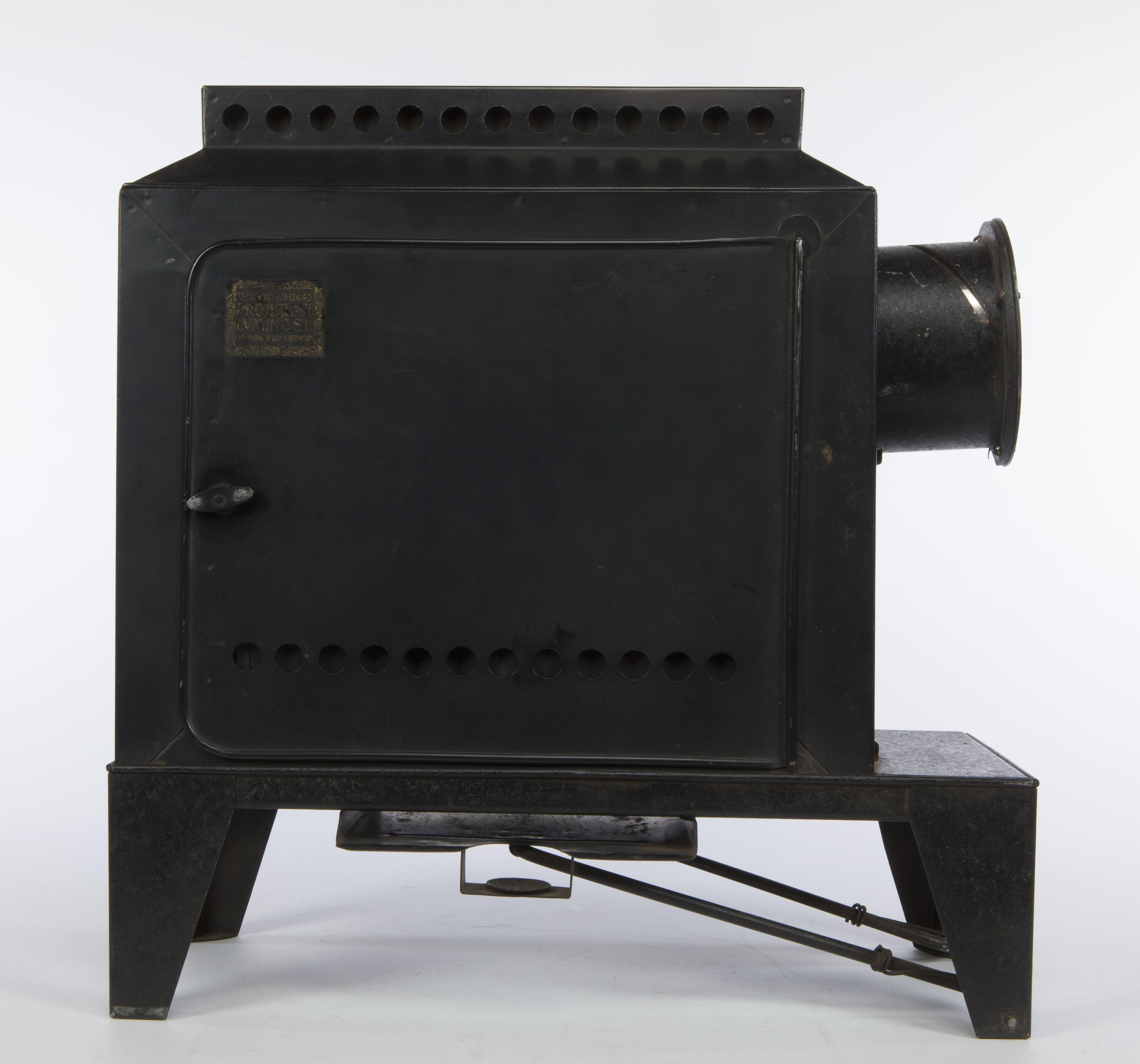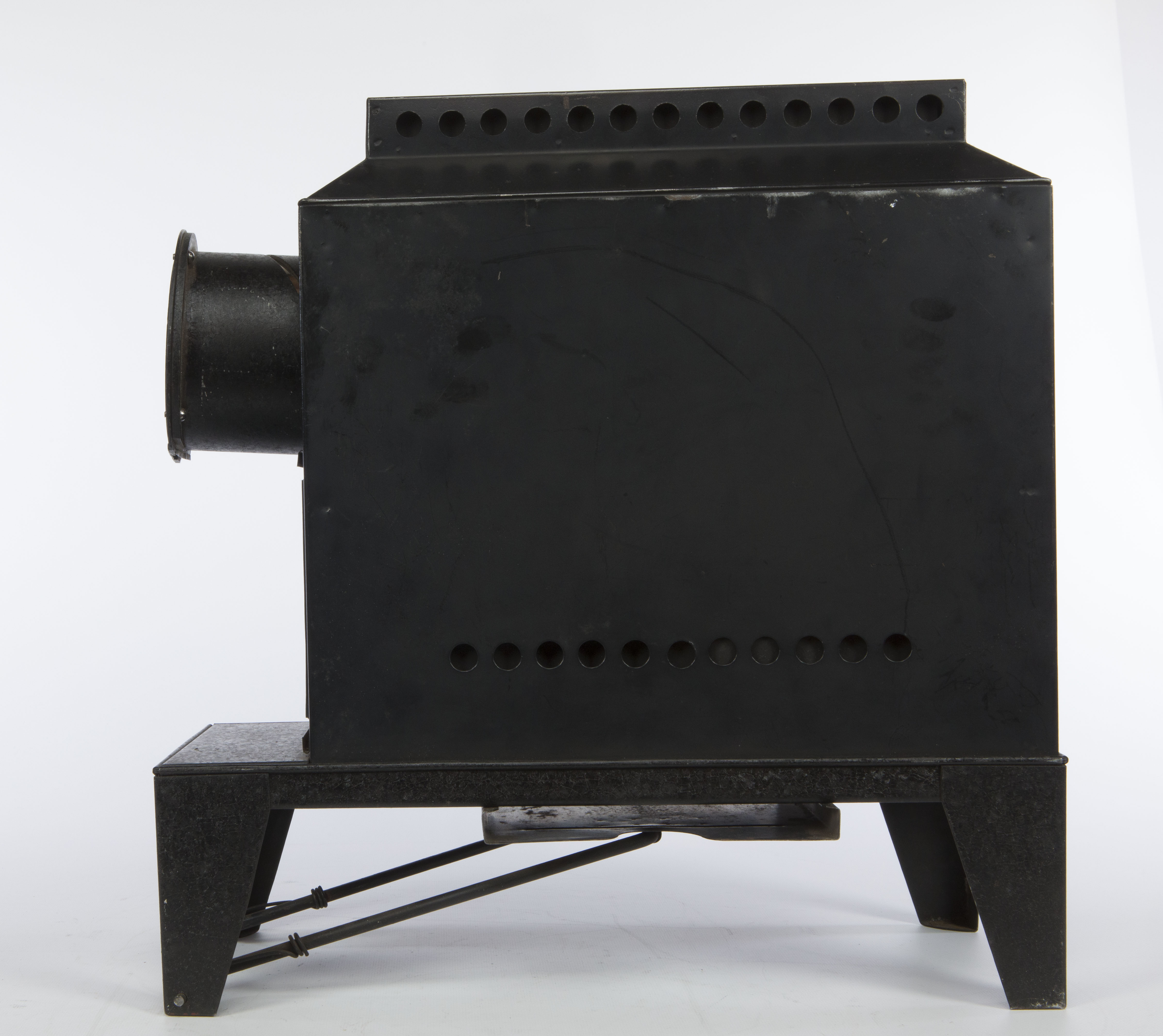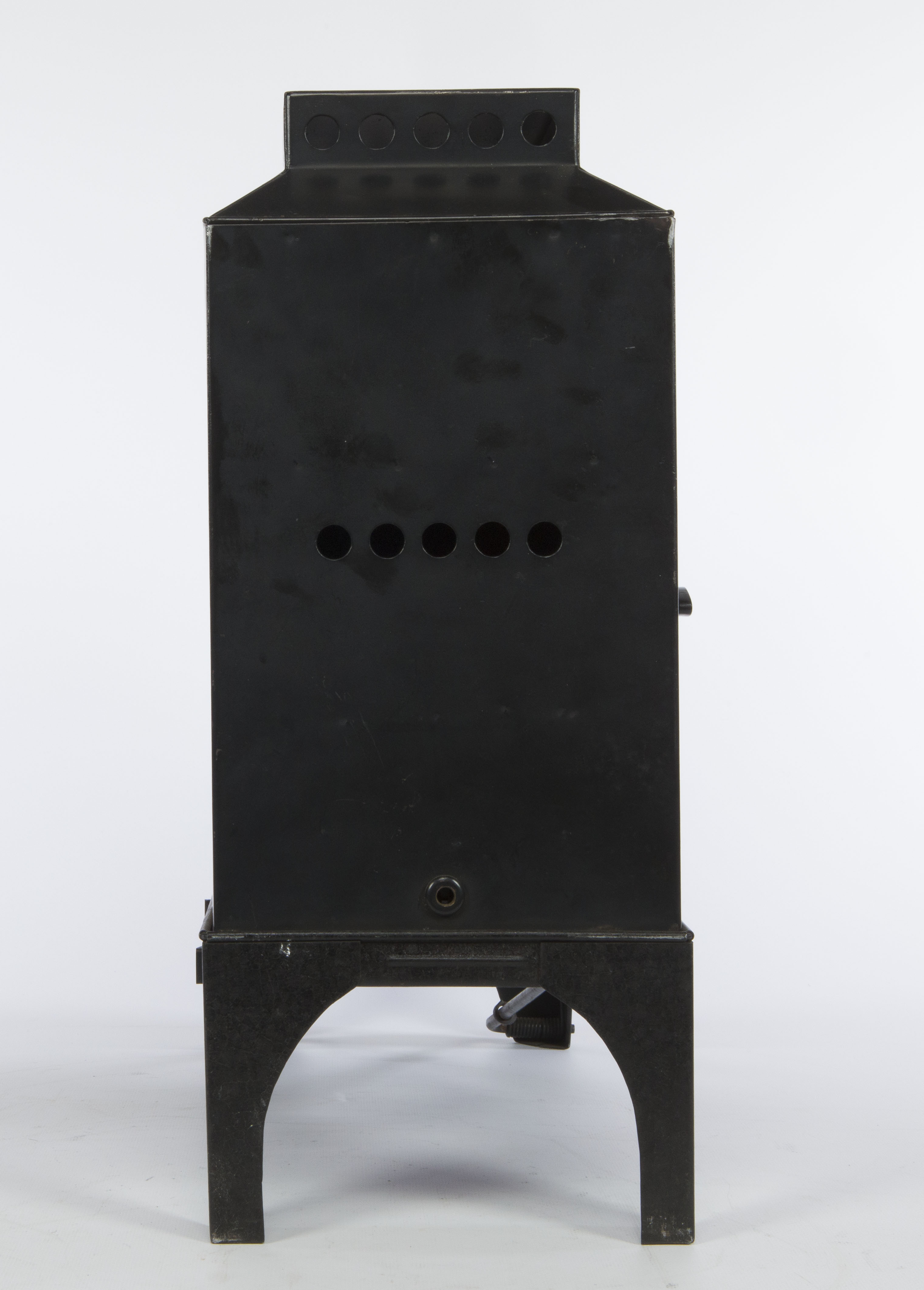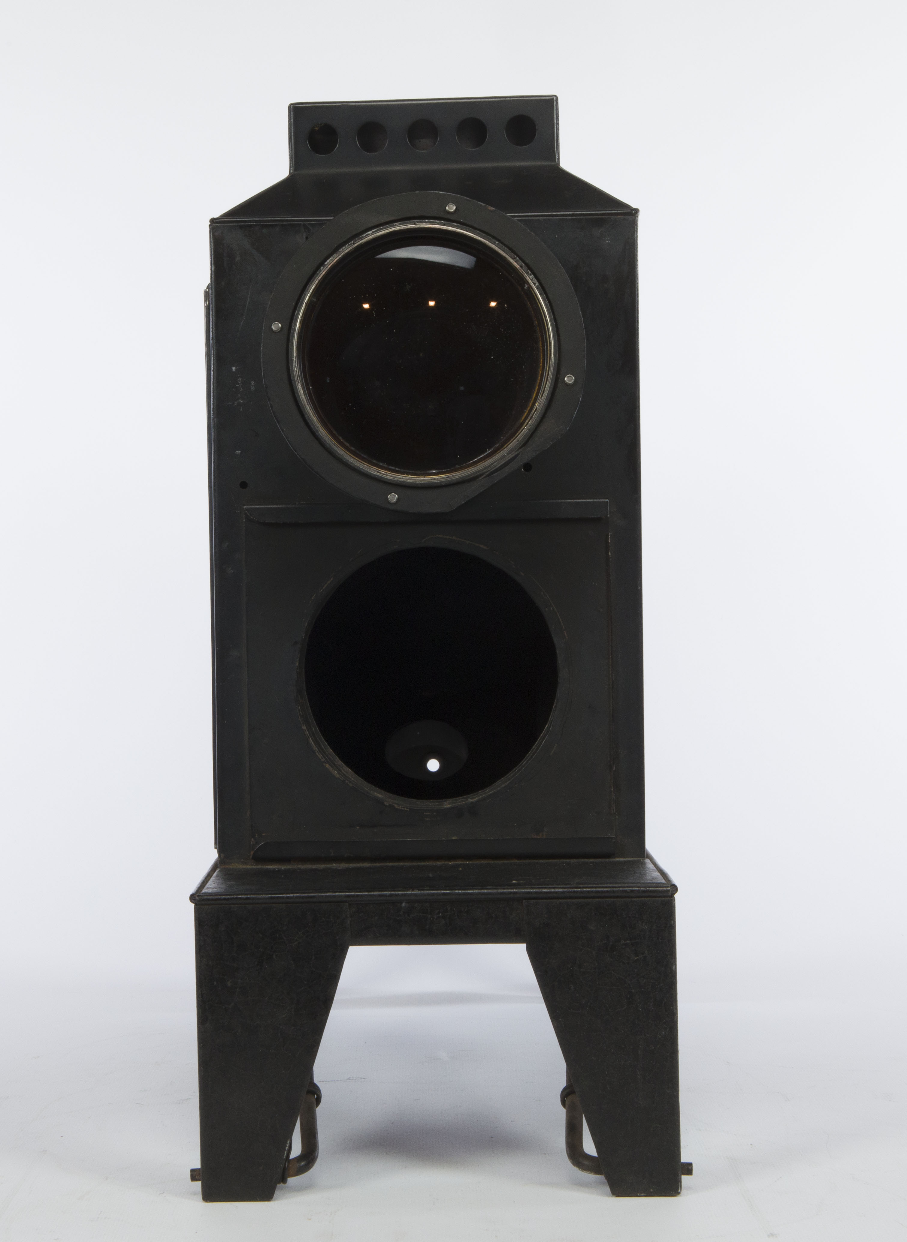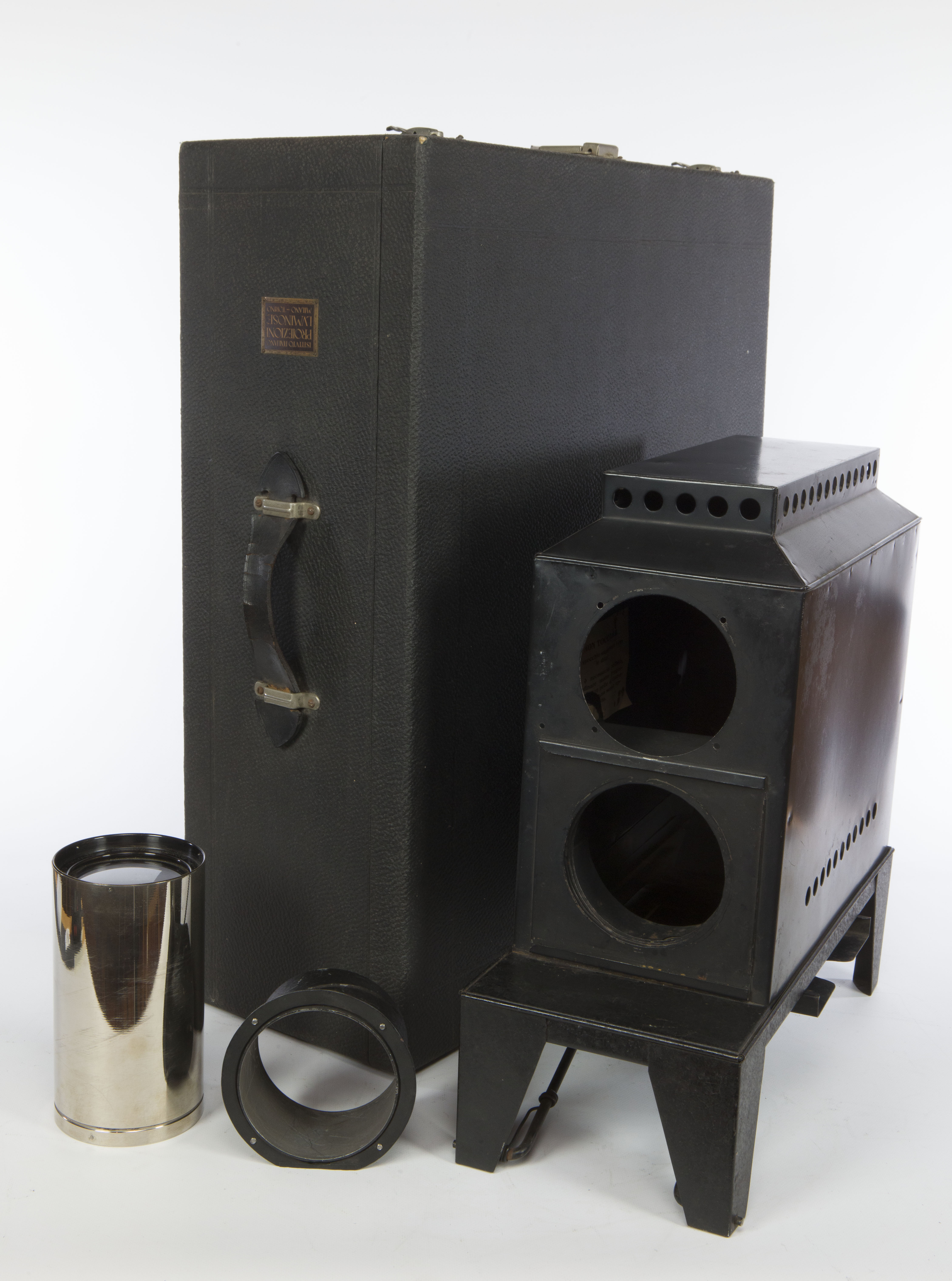 Contenitore: scatola rettangolare in ferro, dotata di quattro piedini dello stesso materiale. Sul lato frontale si trovano l’obiettivo e un foro (manca il tubo di proiezione). Il lato sinistro presenta uno sportello incernierato che consente l'accesso all'interno della macchina, mentre nella parte inferiore della scatola è presente una fessura con un coperchio incernierato. Sul lato posteriore si notano cinque fori allineati orizzontalmente, mentre il lato destro e lo sportello sinistro sono anch'essi forati per facilitare la ventilazione ed evitare il surriscaldamento. Sul lato superiore è presente un caminetto, caratterizzato da una fila di fori disposti lungo tutto il suo perimetro. Il dispositivo è dotato di una custodia a forma di valigetta. Funzione: proiezione di immagini opache, come fotografie, pagine di libri o disegni su una superficie piana, come una parete, per scopi educativi, di intrattenimento e scientifici. Modalità d’uso: posizionare l'episcopio su una superficie stabile, assicurandosi che il proiettore sia orientato correttamente verso lo schermo o la parete dove si desidera proiettare l'immagine. Collegare l'episcopio a una presa elettrica, se dotato di lampadina elettrica. Collocare l'oggetto da proiettare, come una pagina di un libro, una fotografia o un disegno, in modo piatto e stabile sotto la macchina, aprendo lo sportello situato nella parte inferiore della scatola. Accendere la lampadina o la fonte luminosa; l'immagine riflessa dall'oggetto verrà proiettata sullo schermo attraverso un sistema di specchi e lenti