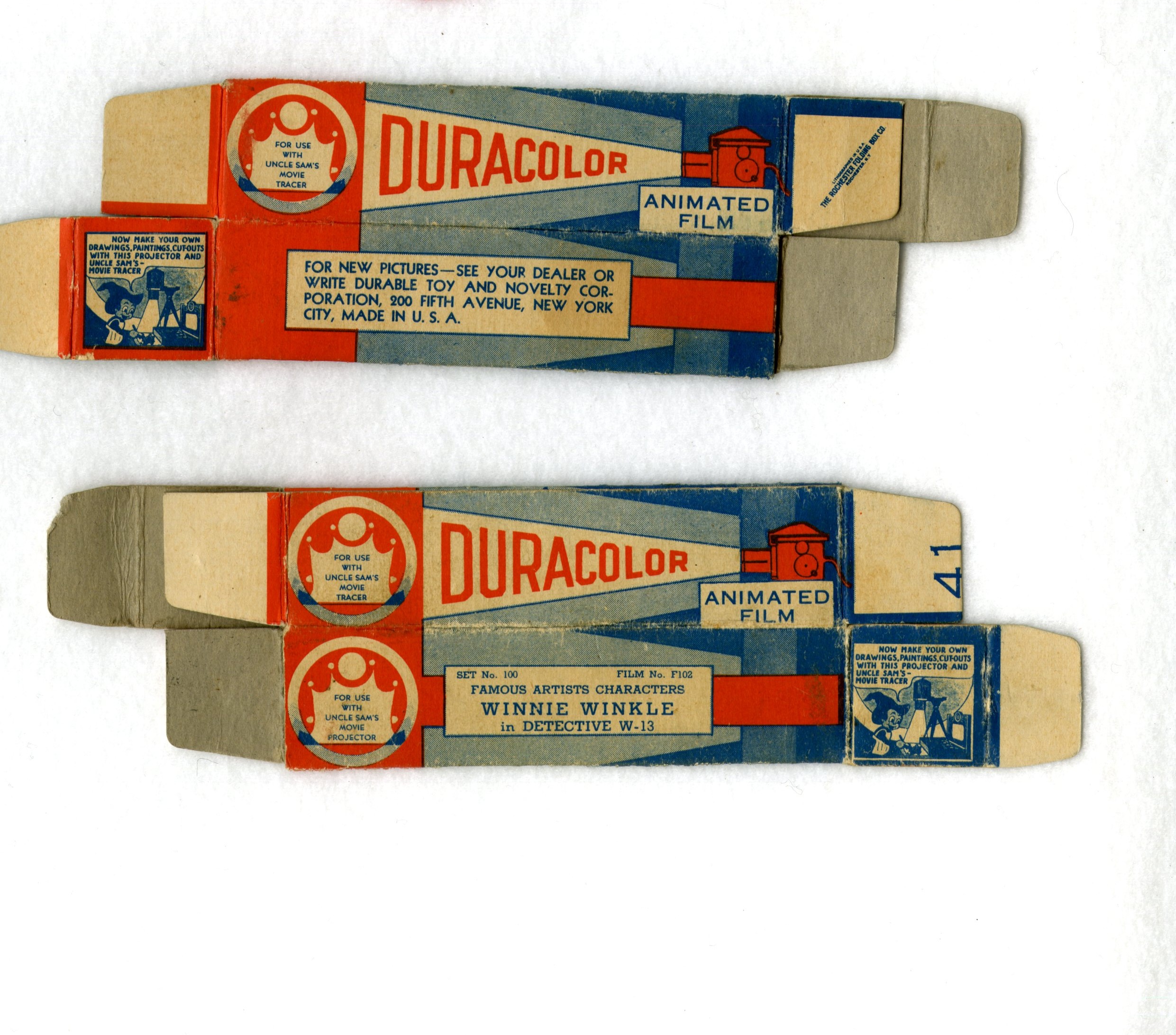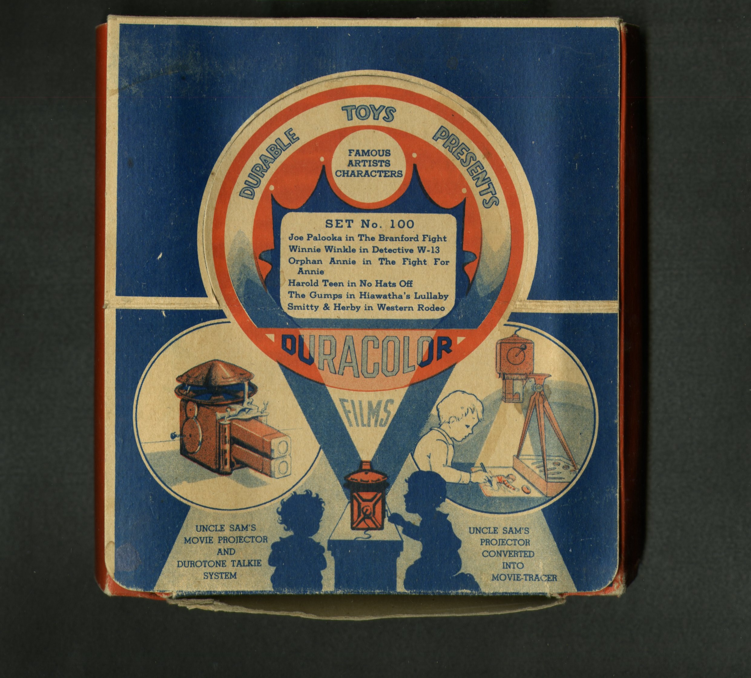 - NOTIZIE STORICO CRITICHE L’industria del suono riprodotto iniziò nel 1877 negli Stati Uniti quando Thomas Edison inventò una maniera di registrare il suono su un foglio di alluminio e di riprodurlo tramite una macchina che chiamò fonografo. Nel corso di una decina di anni, questo sistema venne notevolmente migliorato, prima con l’invenzione nel 1886 dei cilindri di cera Bell-Tainter e poi nel 1887 con l’invenzione del disco e l’adozione dell’incisione orizzontale fatta da Emile Berliner che non solo riproduceva il suono con molta più facilità ma rendeva anche la duplicazione molto più agevole. Parallelamente allo sviluppo della registrazione sonora, anche i settori della fotografia e del cinema stavano evolvendo rapidamente. Tra la fine degli anni Venti e i primi anni Trenta, il perfezionamento delle tecnologie di produzione di motori e diaframmi, insieme agli studi sull'amplificazione acustica, portò alla comparsa sul mercato di grammofoni portatili e di numerosi modelli giocattolo destinati ai bambini. Tra i più popolari vi erano i proiettori con sonoro a disco, progettati per riprodurre cartoni animati in formato ridotto. Uno dei modelli più noti è il proiettore “Uncle Sam’s” e il grammofono “Durotone”, fabbricati negli anni Trenta del Novecento dall’azienda produttrice di giocattoli Durable Toy & Novelty Corp. con sede a New York. Il dispositivo è fatto per proiettare cartoni animati di carta sul muro mentre il suono corrispondente avviene tramite la riproduzione di un disco di piccole dimensioni tramite il grammofono incluso